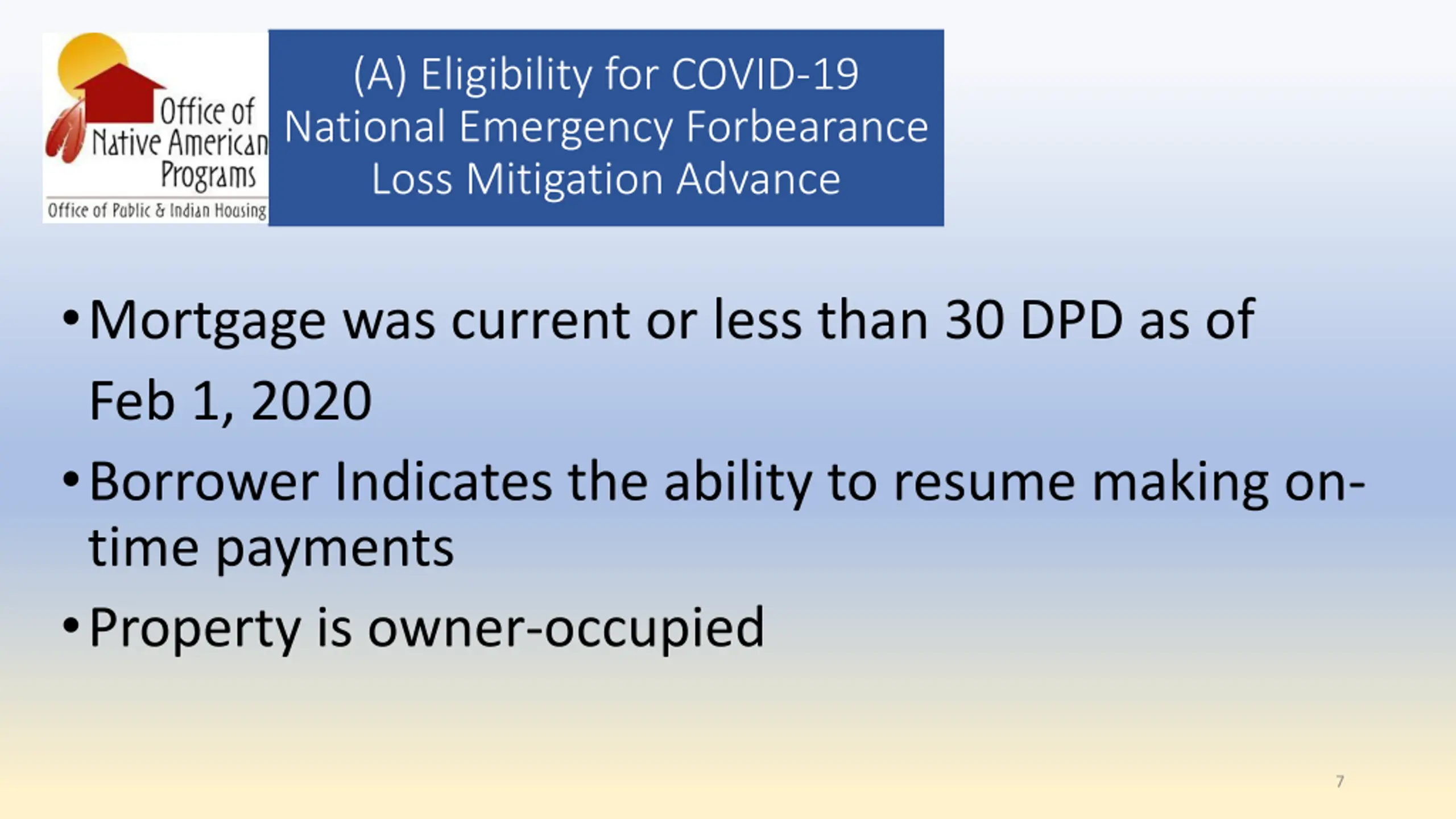 (A) Eligibility for COVID-19 National Emergency Forbearance Loss Mitigation Advance Mortgage was current or less than 30 DPD as of Feb 1, 2020 Borrower Indicates the ability to resume making on- time payments Property is owner-occupied 7