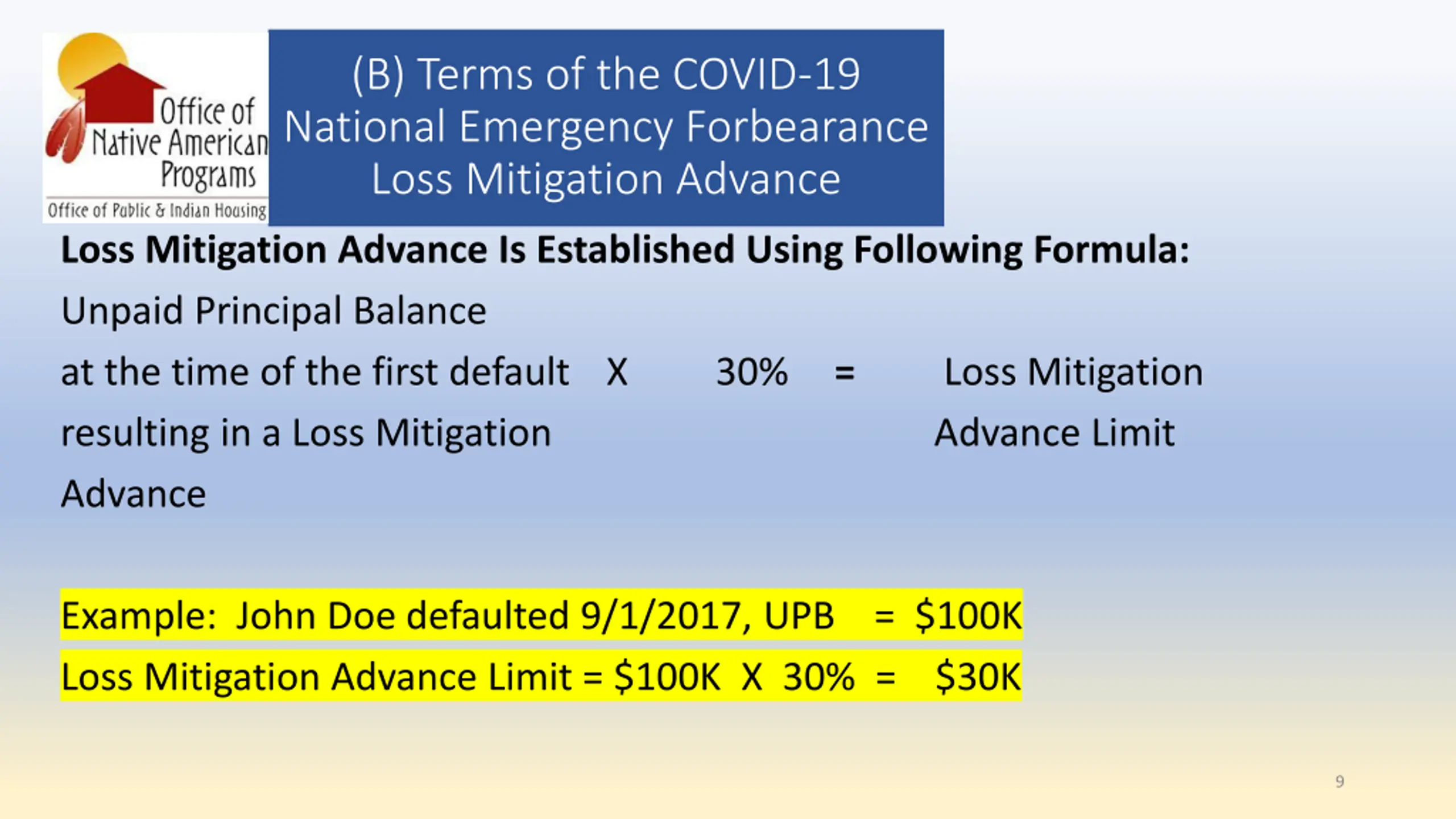 (B) Terms of the COVID-19 National Emergency Forbearance Loss Mitigation Advance Loss Mitigation Advance Is Established Using Following Formula: Unpaid Principal Balance at the time of the first default X resulting in a Loss Mitigation Advance 30% = Loss Mitigation Advance Limit Example: John Doe defaulted 9/1/2017, UPB = $100K Loss Mitigation Advance Limit = $100K X 30% = $30K 9