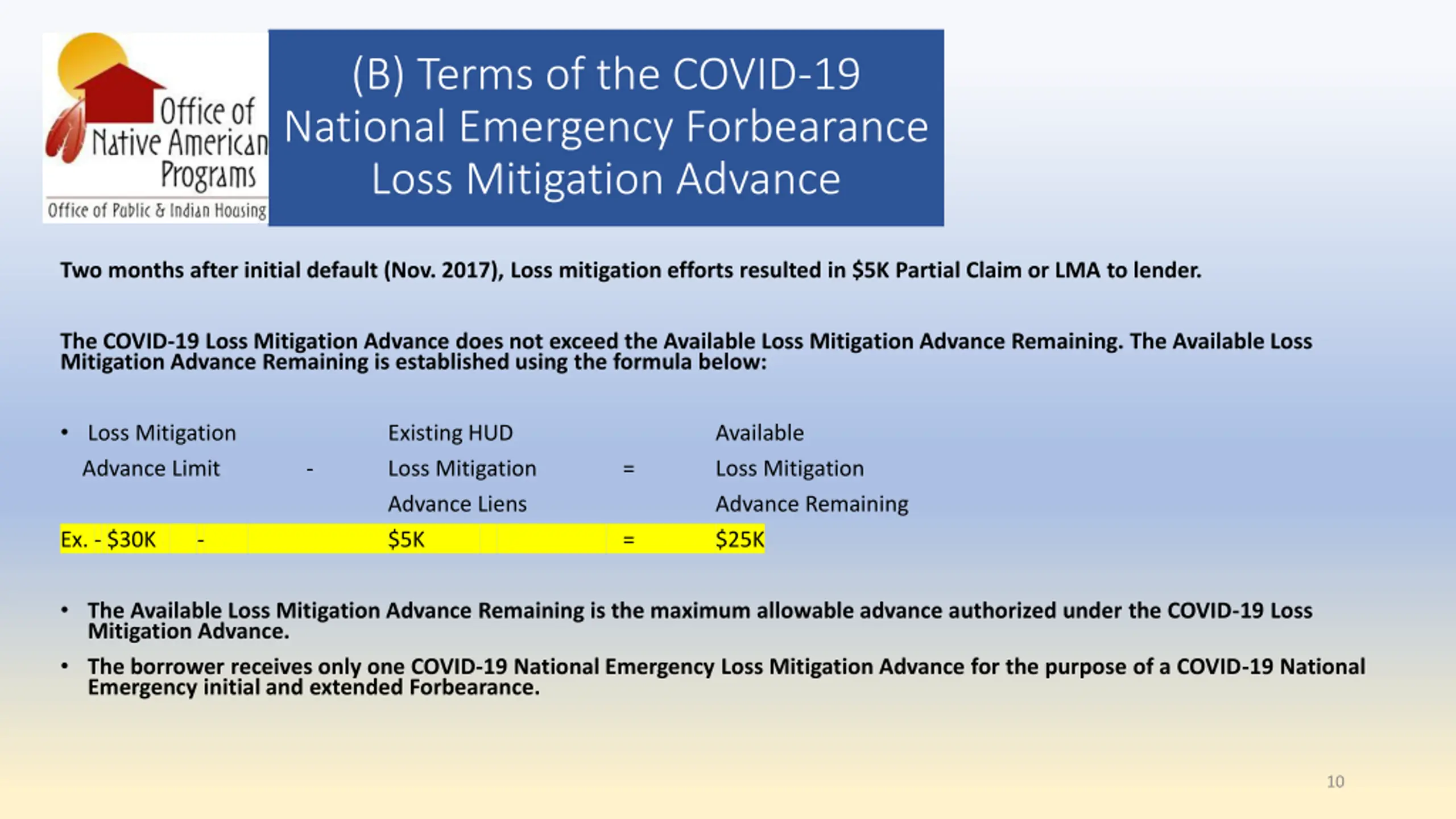 (B) Terms of the COVID-19 National Emergency Forbearance Loss Mitigation Advance Two months after initial default (Nov. 2017), Loss mitigation efforts resulted in $5K Partial Claim or LMA to lender. The COVID-19 Loss Mitigation Advance does not exceed the Available Loss Mitigation Advance Remaining. The Available Loss Mitigation Advance Remaining is established using the formula below: Loss Mitigation Advance Limit Ex. - $30K - Existing HUD Loss Mitigation Advance Liens $5K = = Available Loss Mitigation Advance Remaining $25K - The Available Loss Mitigation Advance Remaining is the maximum allowable advance authorized under the COVID-19 Loss Mitigation Advance. The borrower receives only one COVID-19 National Emergency Loss Mitigation Advance for the purpose of a COVID-19 National Emergency initial and extended Forbearance. 10