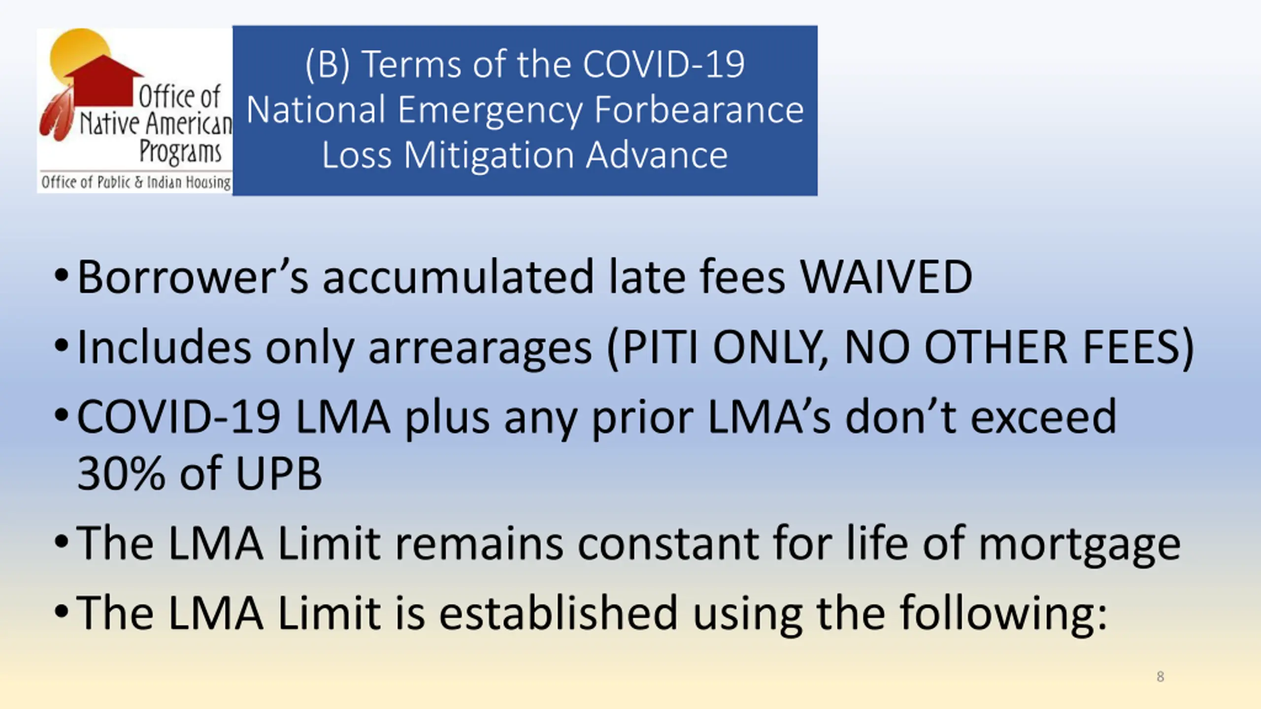 (B) Terms of the COVID-19 National Emergency Forbearance Loss Mitigation Advance Borrower s accumulated late fees WAIVED Includes only arrearages (PITI ONLY, NO OTHER FEES) COVID-19 LMA plus any prior LMA s don t exceed 30% of UPB The LMA Limit remains constant for life of mortgage The LMA Limit is established using the following: 8