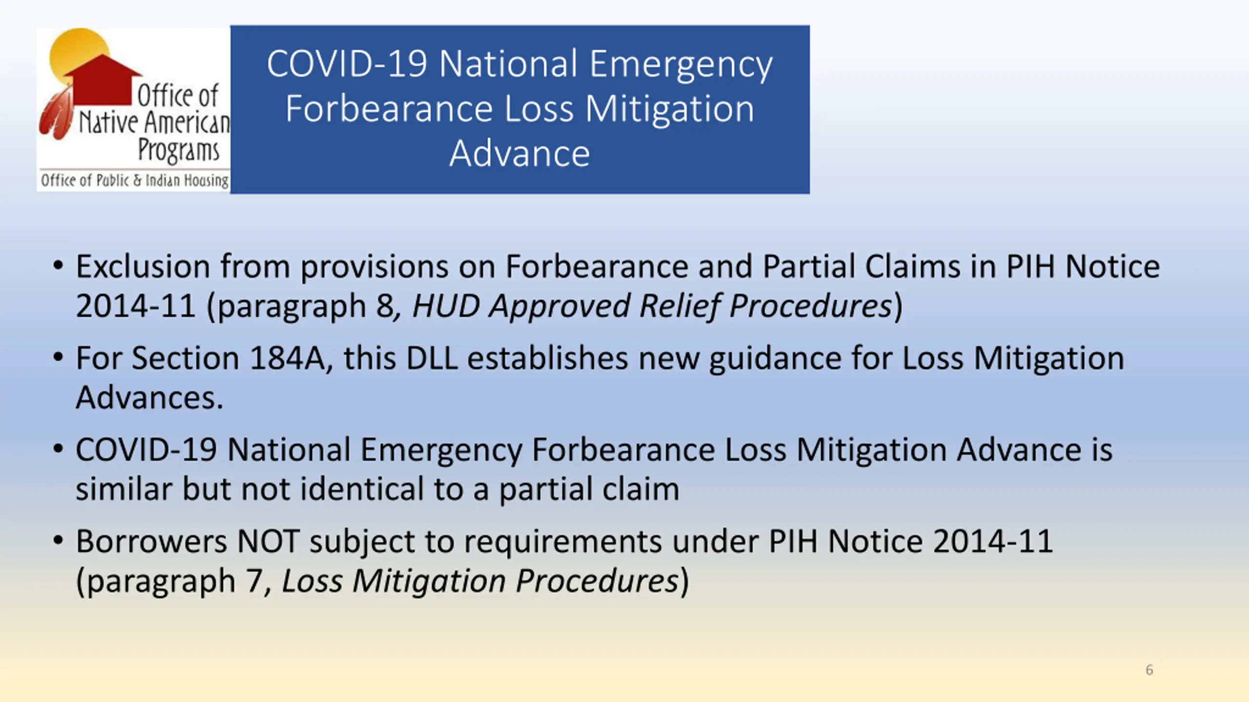 COVID-19 National Emergency Forbearance Loss Mitigation Advance Exclusion from provisions on Forbearance and Partial Claims in PIH Notice 2014-11 (paragraph 8, HUD Approved Relief Procedures) For Section 184A, this DLL establishes new guidance for Loss Mitigation Advances. COVID-19 National Emergency Forbearance Loss Mitigation Advance is similar but not identical to a partial claim Borrowers NOT subject to requirements under PIH Notice 2014-11 (paragraph 7, Loss Mitigation Procedures) 6