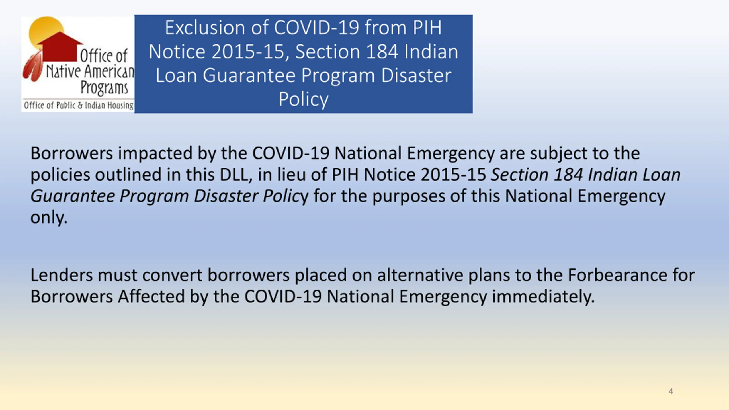 Exclusion of COVID-19 from PIH Notice 2015-15, Section 184 Indian Loan Guarantee Program Disaster Policy Borrowers impacted by the COVID-19 National Emergency are subject to the policies outlined in this DLL, in lieu of PIH Notice 2015-15 Section 184 Indian Loan Guarantee Program Disaster Policy for the purposes of this National Emergency only. Lenders must convert borrowers placed on alternative plans to the Forbearance for Borrowers Affected by the COVID-19 National Emergency immediately. 4