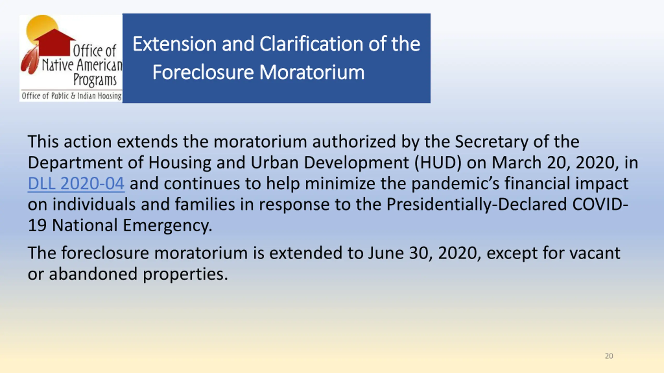 Extension and Clarification of the Extension and Clarification of the Foreclosure Moratorium Foreclosure Moratorium This action extends the moratorium authorized by the Secretary of the Department of Housing and Urban Development (HUD) on March 20, 2020, in DLL 2020-04 and continues to help minimize the pandemic s financial impact on individuals and families in response to the Presidentially-Declared COVID- 19 National Emergency. The foreclosure moratorium is extended to June 30, 2020, except for vacant or abandoned properties. 20