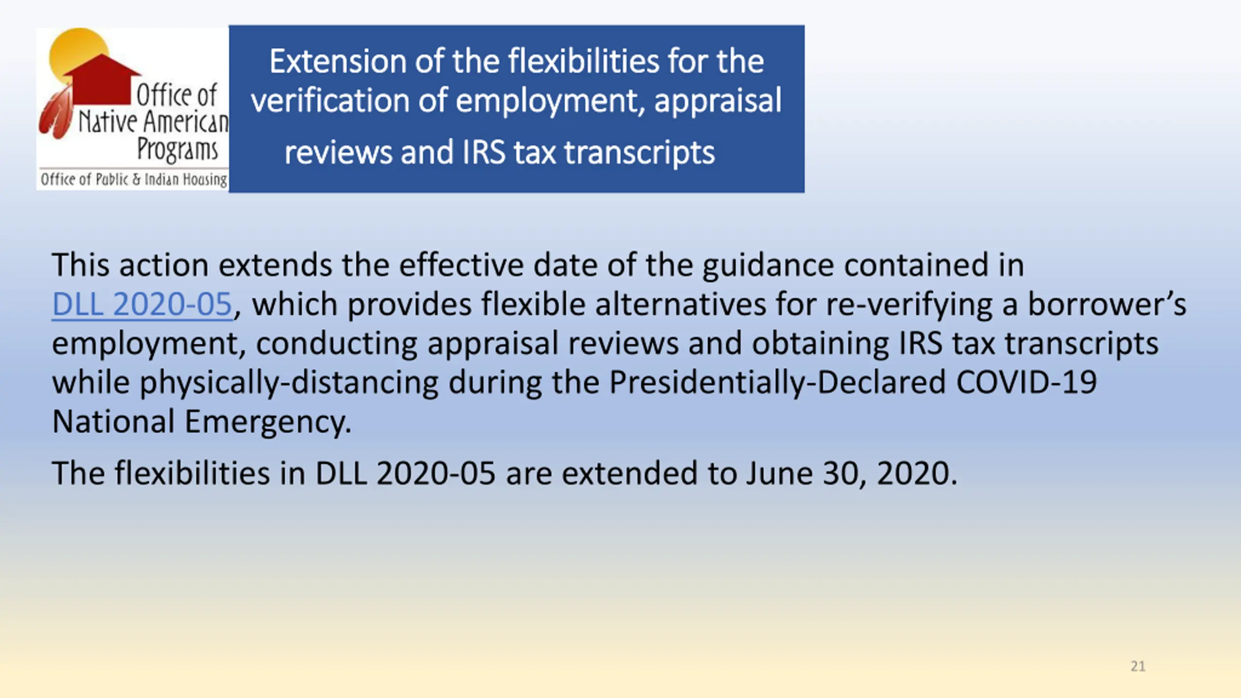 Extension of the flexibilities for the Extension of the flexibilities for the verification of employment, appraisal verification of employment, appraisal reviews and IRS tax transcripts reviews and IRS tax transcripts This action extends the effective date of the guidance contained in DLL 2020-05, which provides flexible alternatives for re-verifying a borrower s employment, conducting appraisal reviews and obtaining IRS tax transcripts while physically-distancing during the Presidentially-Declared COVID-19 National Emergency. The flexibilities in DLL 2020-05 are extended to June 30, 2020. 21