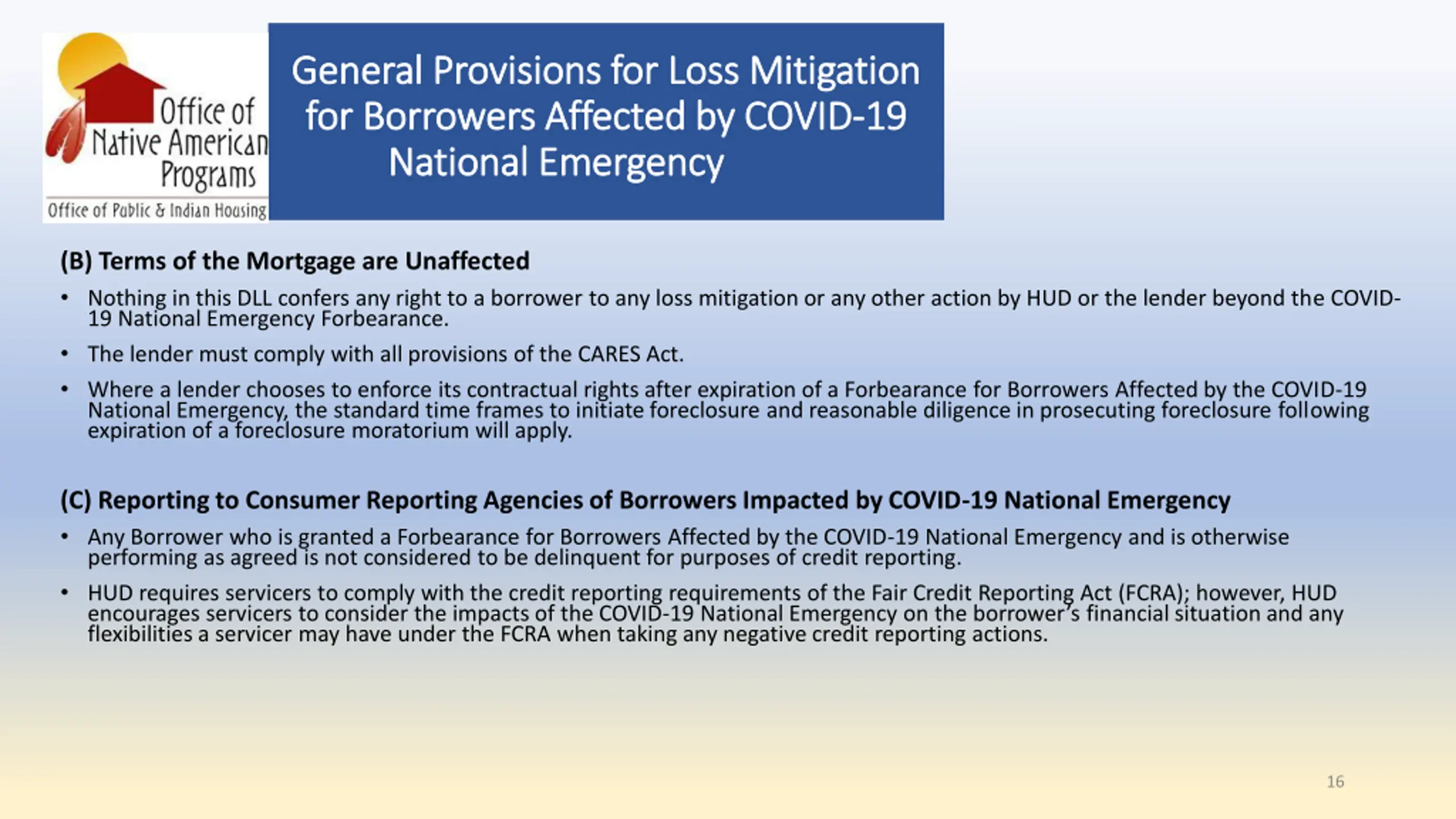 General Provisions for Loss Mitigation General Provisions for Loss Mitigation for Borrowers Affected by COVID for Borrowers Affected by COVID- -19 National Emergency National Emergency (B) Terms of the Mortgage are Unaffected Nothing in this DLL confers any right to a borrower to any loss mitigation or any other action by HUD or the lender beyond the COVID- 19 National Emergency Forbearance. The lender must comply with all provisions of the CARES Act. Where a lender chooses to enforce its contractual rights after expiration of a Forbearance for Borrowers Affected by the COVID-19 National Emergency, the standard time frames to initiate foreclosure and reasonable diligence in prosecuting foreclosure following expiration of a foreclosure moratorium will apply. 19 (C) Reporting to Consumer Reporting Agencies of Borrowers Impacted by COVID-19 National Emergency Any Borrower who is granted a Forbearance for Borrowers Affected by the COVID-19 National Emergency and is otherwise performing as agreed is not considered to be delinquent for purposes of credit reporting. HUD requires servicers to comply with the credit reporting requirements of the Fair Credit Reporting Act (FCRA); however, HUD encourages servicers to consider the impacts of the COVID-19 National Emergency on the borrower s financial situation and any flexibilities a servicer may have under the FCRA when taking any negative credit reporting actions. 16