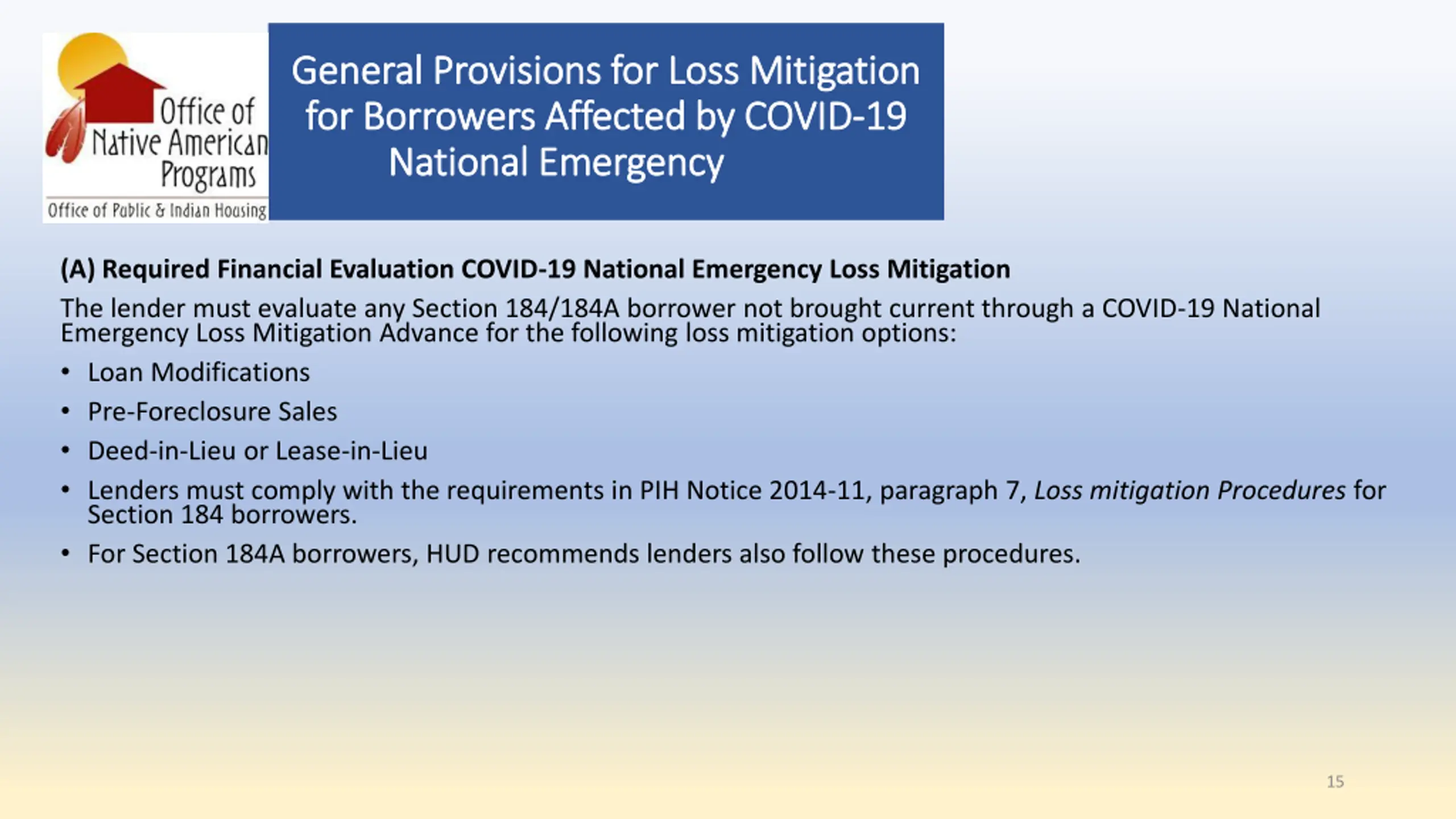 General Provisions for Loss Mitigation General Provisions for Loss Mitigation for Borrowers Affected by COVID for Borrowers Affected by COVID- -19 National Emergency National Emergency (A) Required Financial Evaluation COVID-19 National Emergency Loss Mitigation The lender must evaluate any Section 184/184A borrower not brought current through a COVID-19 National Emergency Loss Mitigation Advance for the following loss mitigation options: Loan Modifications Pre-Foreclosure Sales Deed-in-Lieu or Lease-in-Lieu Lenders must comply with the requirements in PIH Notice 2014-11, paragraph 7, Loss mitigation Procedures for Section 184 borrowers. For Section 184A borrowers, HUD recommends lenders also follow these procedures. 19 15