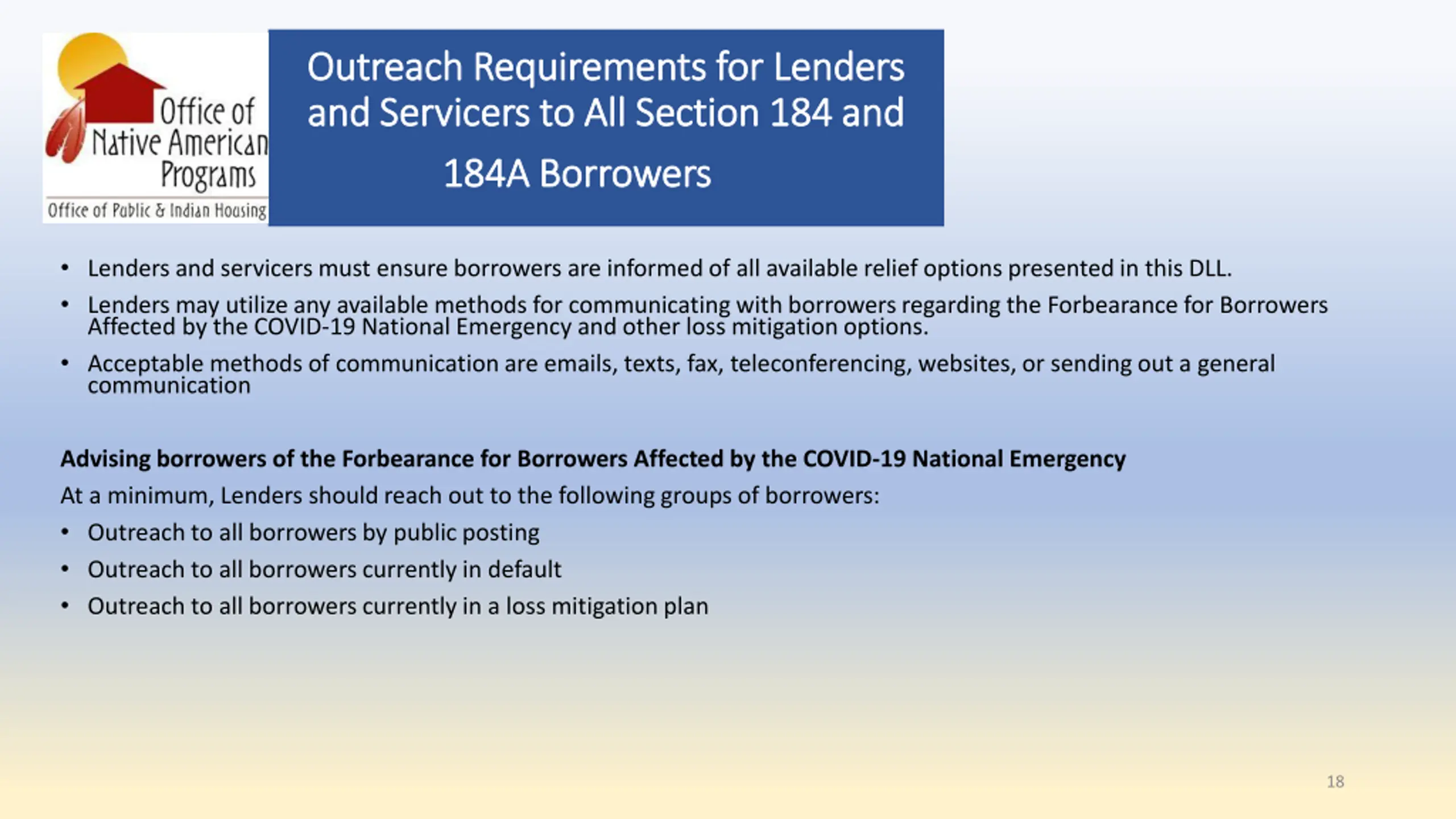 Outreach Requirements for Lenders Outreach Requirements for Lenders and Servicers to All Section 184 and and Servicers to All Section 184 and 184A Borrowers 184A Borrowers Lenders and servicers must ensure borrowers are informed of all available relief options presented in this DLL. Lenders may utilize any available methods for communicating with borrowers regarding the Forbearance for Borrowers Affected by the COVID-19 National Emergency and other loss mitigation options. Acceptable methods of communication are emails, texts, fax, teleconferencing, websites, or sending out a general communication Advising borrowers of the Forbearance for Borrowers Affected by the COVID-19 National Emergency At a minimum, Lenders should reach out to the following groups of borrowers: Outreach to all borrowers by public posting Outreach to all borrowers currently in default Outreach to all borrowers currently in a loss mitigation plan 18