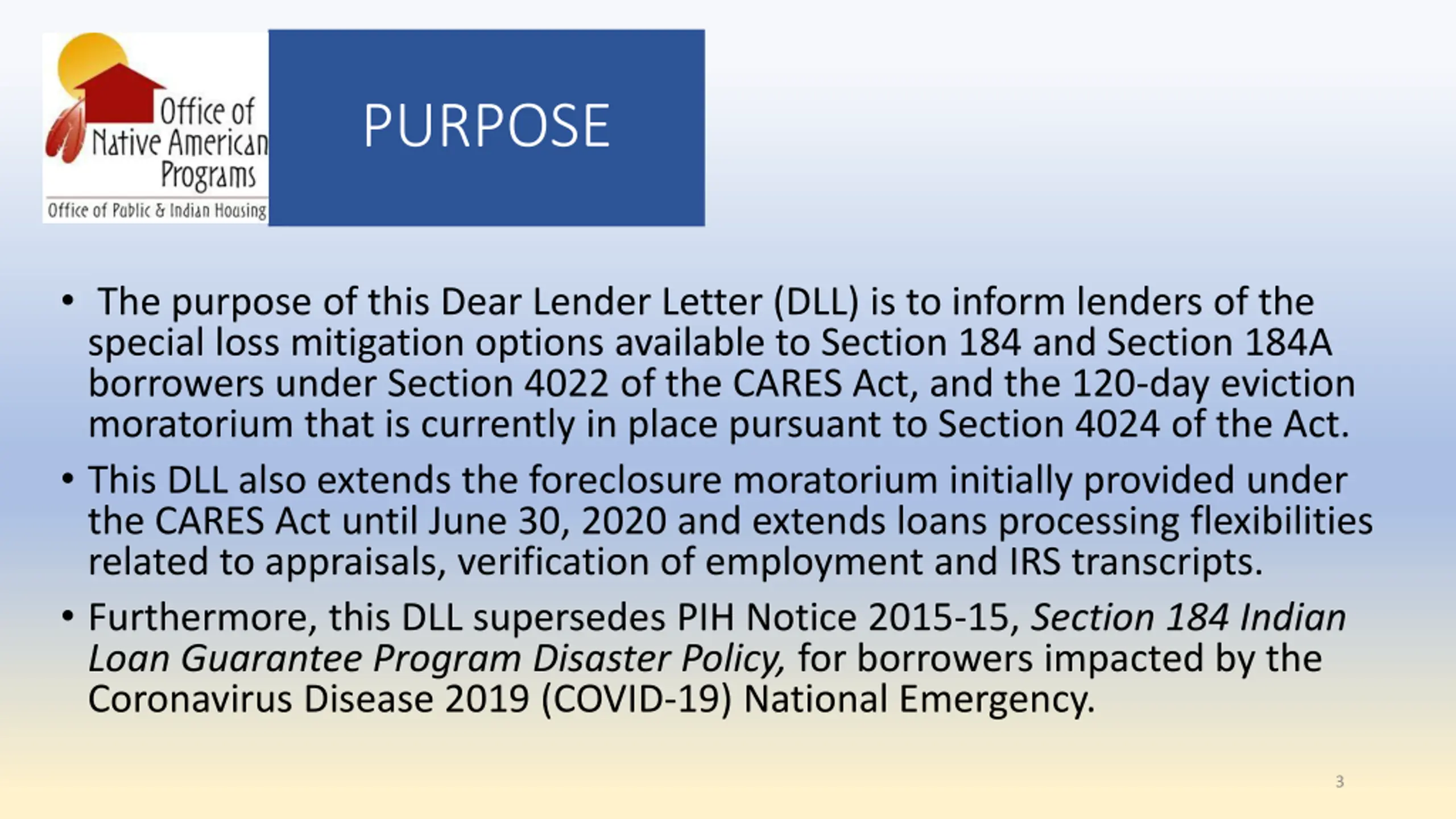 PURPOSE The purpose of this Dear Lender Letter (DLL) is to inform lenders of the special loss mitigation options available to Section 184 and Section 184A borrowers under Section 4022 of the CARES Act, and the 120-day eviction moratorium that is currently in place pursuant to Section 4024 of the Act. This DLL also extends the foreclosure moratorium initially provided under the CARES Act until June 30, 2020 and extends loans processing flexibilities related to appraisals, verification of employment and IRS transcripts. Furthermore, this DLL supersedes PIH Notice 2015-15, Section 184 Indian Loan Guarantee Program Disaster Policy, for borrowers impacted by the Coronavirus Disease 2019 (COVID-19) National Emergency. 3