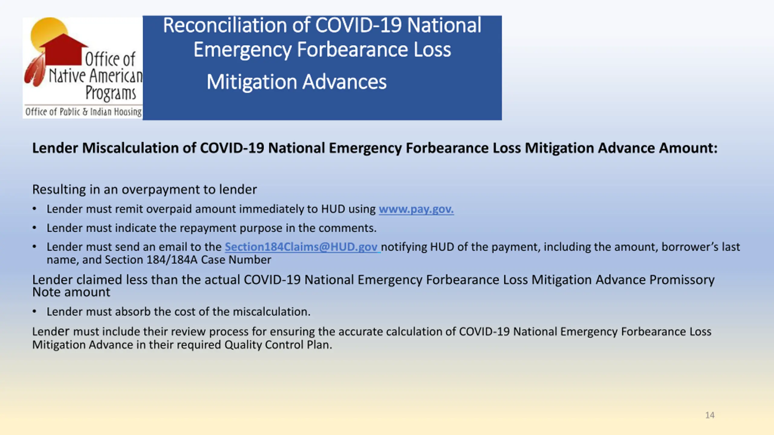 Reconciliation of COVID Reconciliation of COVID- -19 National Emergency Forbearance Loss Emergency Forbearance Loss Mitigation Advances Mitigation Advances 19 National Lender Miscalculation of COVID-19 National Emergency Forbearance Loss Mitigation Advance Amount: Resulting in an overpayment to lender Lender must remit overpaid amount immediately to HUD using www.pay.gov. Lender must indicate the repayment purpose in the comments. Lender must send an email to the Section184Claims@HUD.gov notifying HUD of the payment, including the amount, borrower s last name, and Section 184/184A Case Number Lender claimed less than the actual COVID-19 National Emergency Forbearance Loss Mitigation Advance Promissory Note amount Lender must absorb the cost of the miscalculation. Lender must include their review process for ensuring the accurate calculation of COVID-19 National Emergency Forbearance Loss Mitigation Advance in their required Quality Control Plan. 14