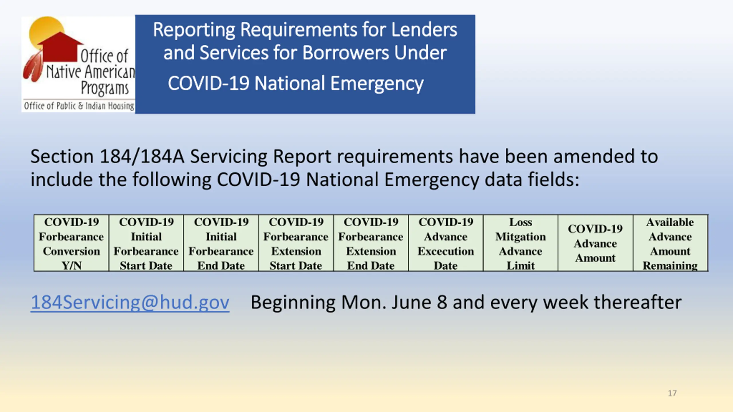 Reporting Requirements for Lenders Reporting Requirements for Lenders and Services for Borrowers Under and Services for Borrowers Under COVID COVID- -19 National Emergency 19 National Emergency Section 184/184A Servicing Report requirements have been amended to include the following COVID-19 National Emergency data fields: COVID-19 Forbearance Conversion Y/N COVID-19 Initial Forbearance Start Date COVID-19 Initial Forbearance End Date COVID-19 Forbearance Extension Start Date COVID-19 Forbearance Extension End Date COVID-19 Advance Excecution Date Loss Available Advance Amount Remaining COVID-19 Advance Amount Mitgation Advance Limit 184Servicing@hud.gov Beginning Mon. June 8 and every week thereafter 17