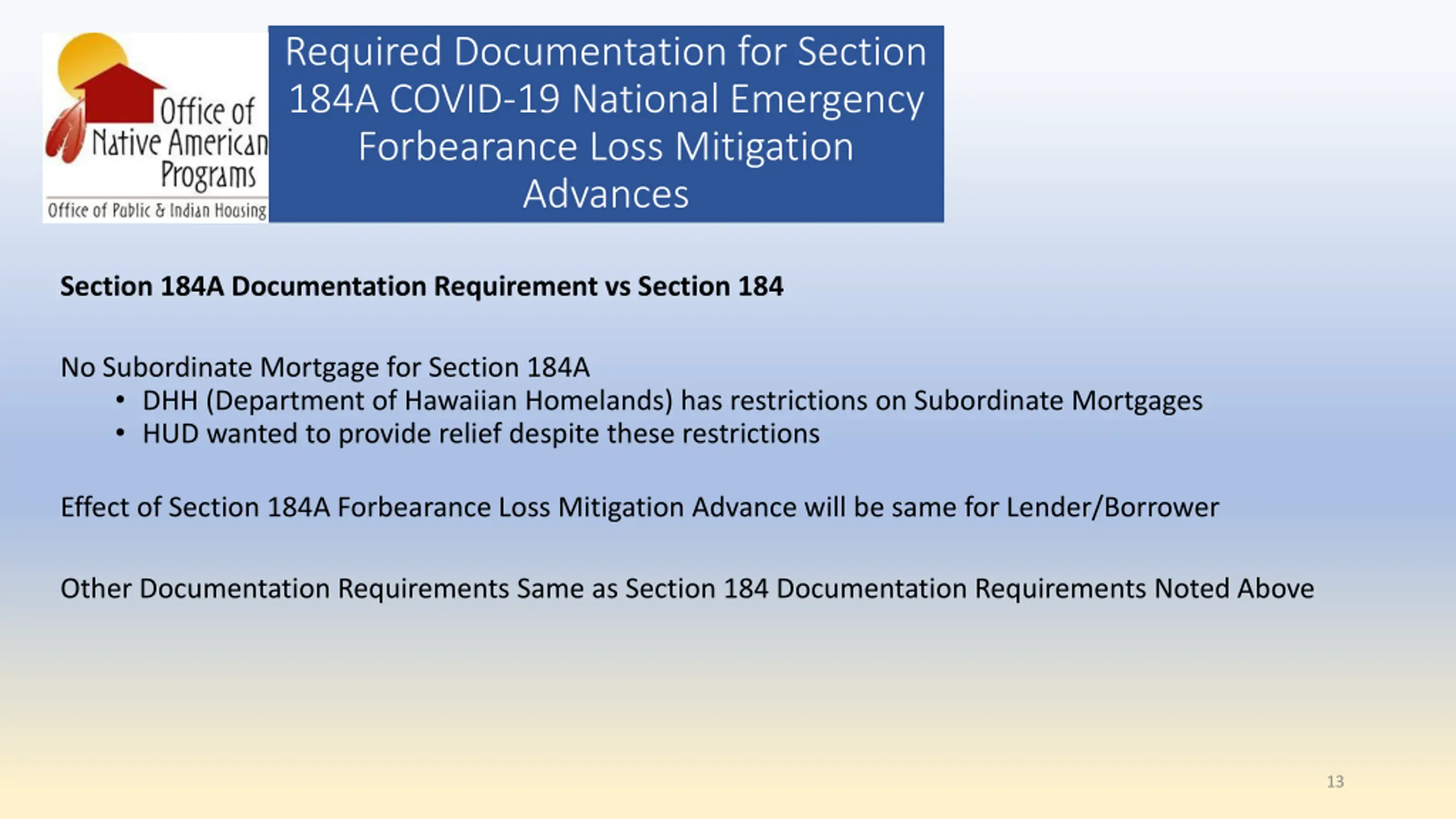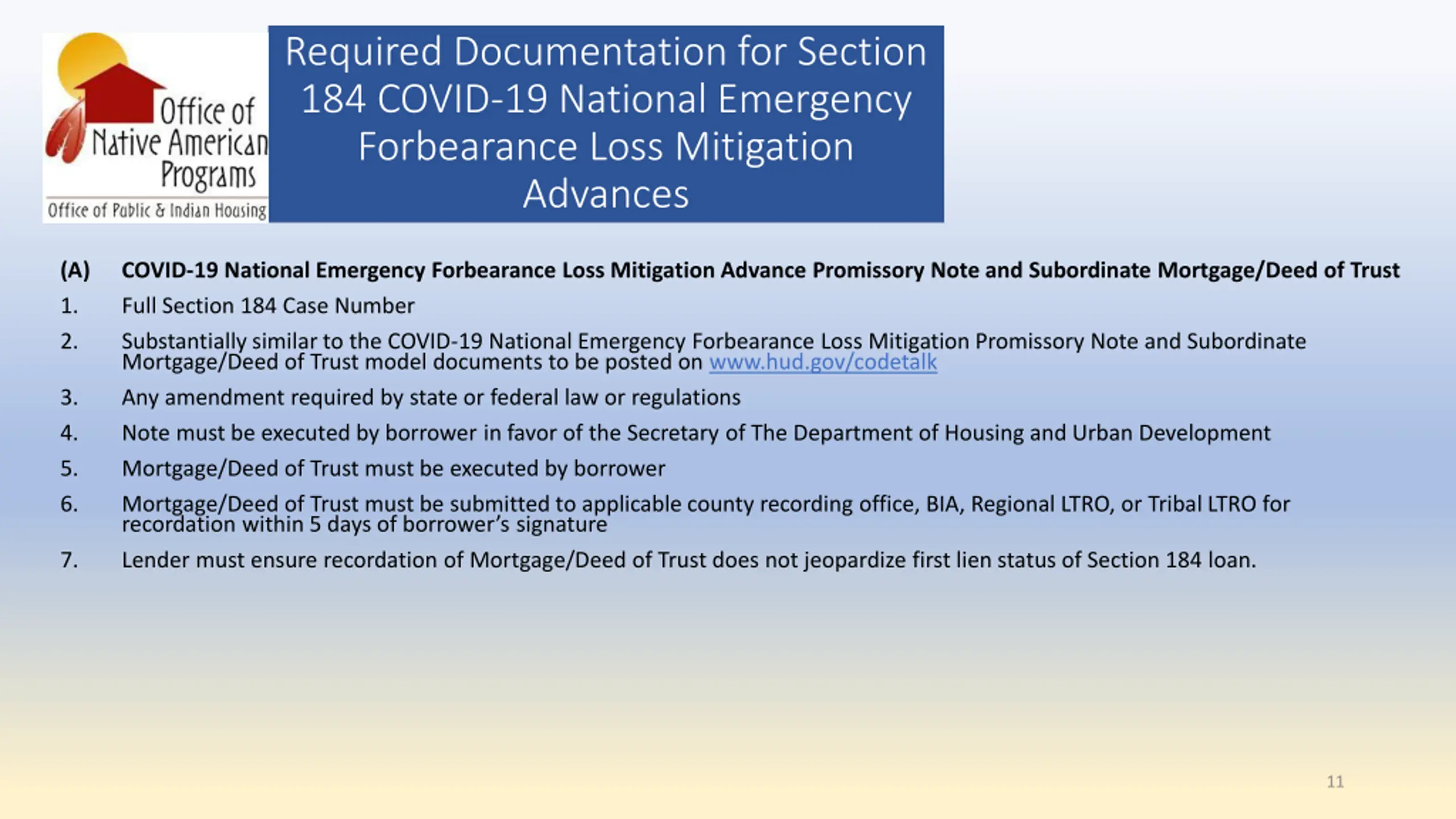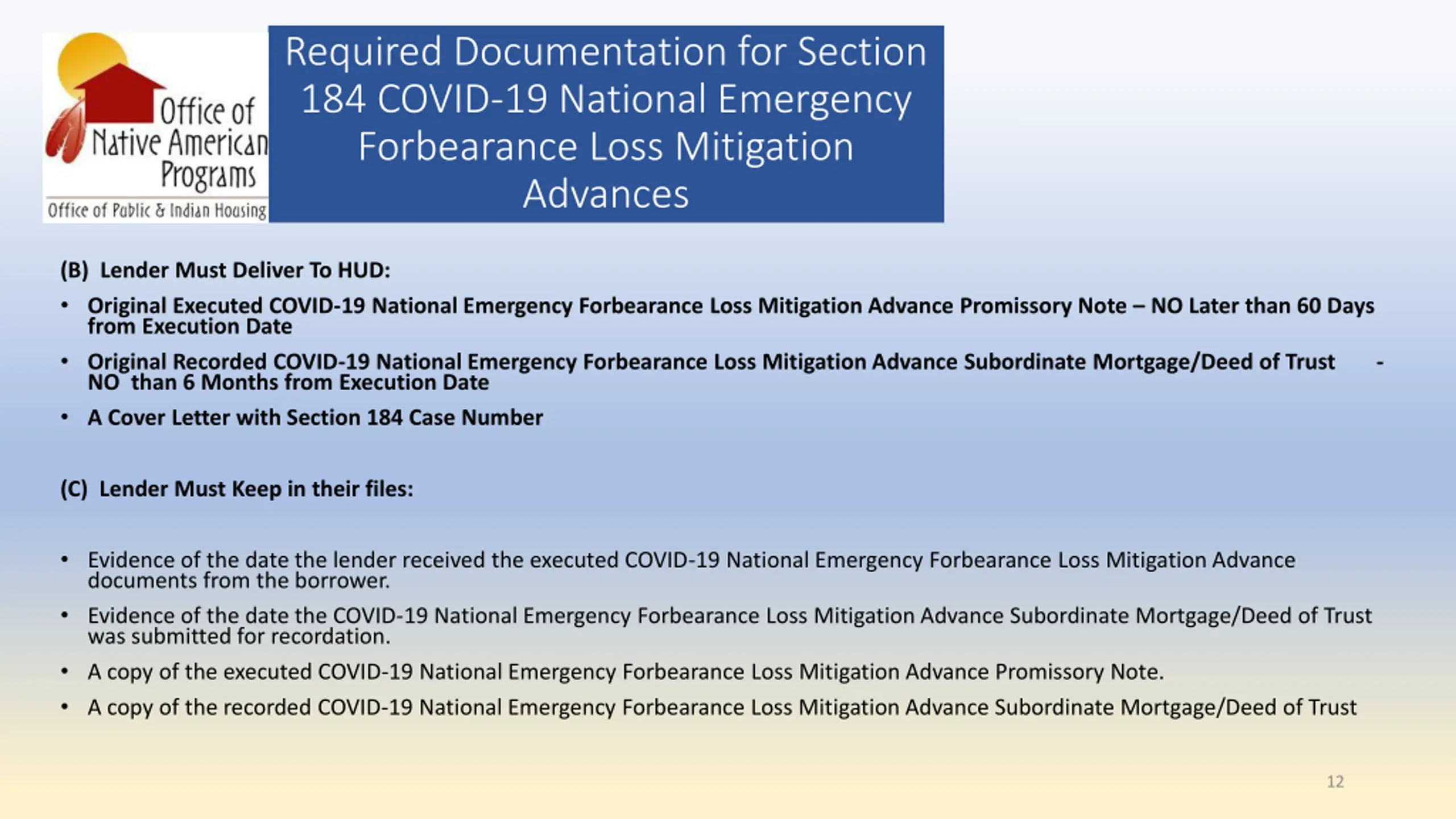 Required Documentation for Section 184 COVID-19 National Emergency Forbearance Loss Mitigation Advances (B) Lender Must Deliver To HUD: Original Executed COVID-19 National Emergency Forbearance Loss Mitigation Advance Promissory Note NO Later than 60 Days from Execution Date Original Recorded COVID-19 National Emergency Forbearance Loss Mitigation Advance Subordinate Mortgage/Deed of Trust NO than 6 Months from Execution Date A Cover Letter with Section 184 Case Number - (C) Lender Must Keep in their files: Evidence of the date the lender received the executed COVID-19 National Emergency Forbearance Loss Mitigation Advance documents from the borrower. Evidence of the date the COVID-19 National Emergency Forbearance Loss Mitigation Advance Subordinate Mortgage/Deed of Trust was submitted for recordation. A copy of the executed COVID-19 National Emergency Forbearance Loss Mitigation Advance Promissory Note. A copy of the recorded COVID-19 National Emergency Forbearance Loss Mitigation Advance Subordinate Mortgage/Deed of Trust 12