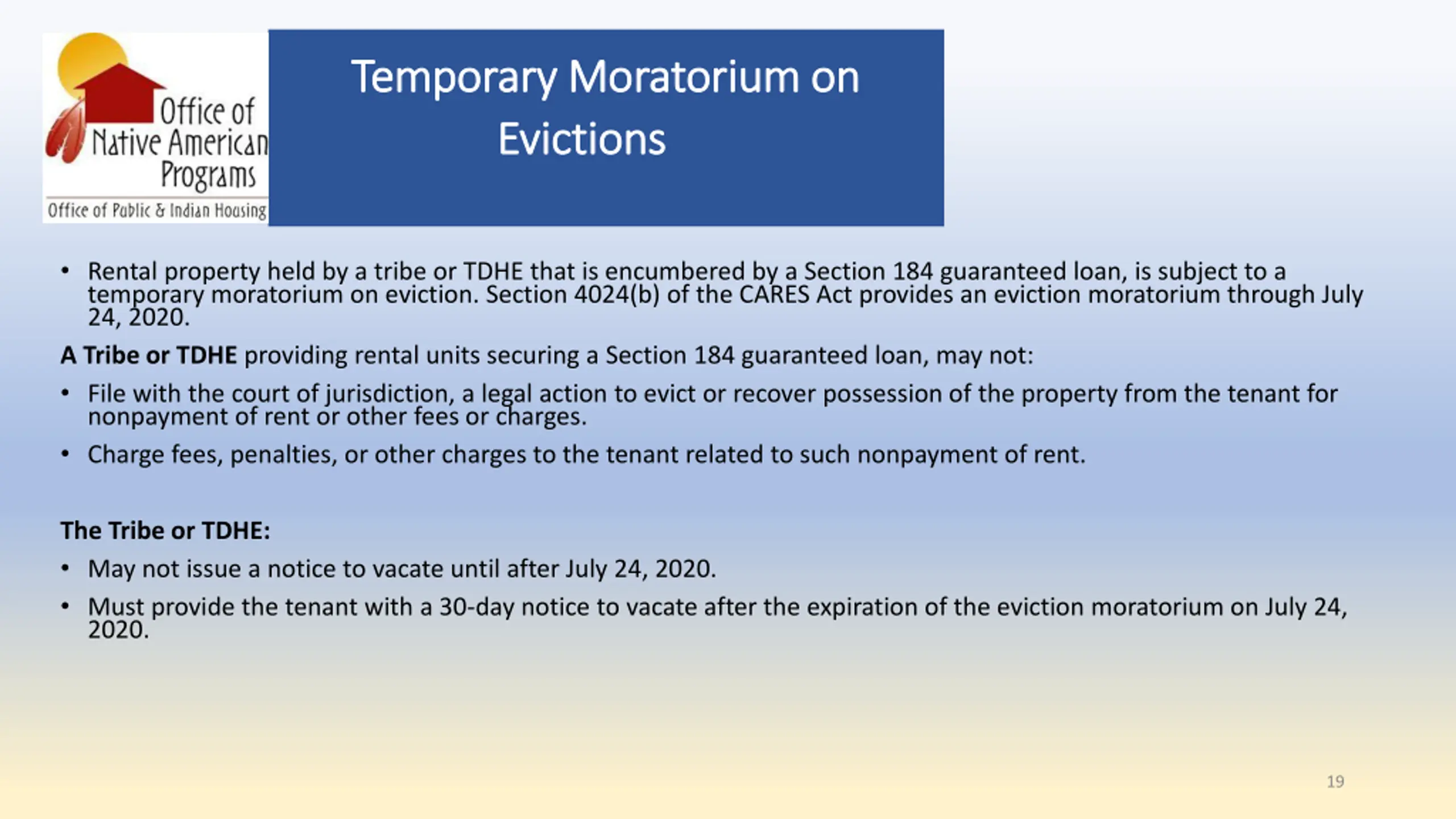 Temporary Moratorium on Temporary Moratorium on Evictions Evictions Rental property held by a tribe or TDHE that is encumbered by a Section 184 guaranteed loan, is subject to a temporary moratorium on eviction. Section 4024(b) of the CARES Act provides an eviction moratorium through July 24, 2020. A Tribe or TDHE providing rental units securing a Section 184 guaranteed loan, may not: File with the court of jurisdiction, a legal action to evict or recover possession of the property from the tenant for nonpayment of rent or other fees or charges. Charge fees, penalties, or other charges to the tenant related to such nonpayment of rent. The Tribe or TDHE: May not issue a notice to vacate until after July 24, 2020. Must provide the tenant with a 30-day notice to vacate after the expiration of the eviction moratorium on July 24, 2020. 19