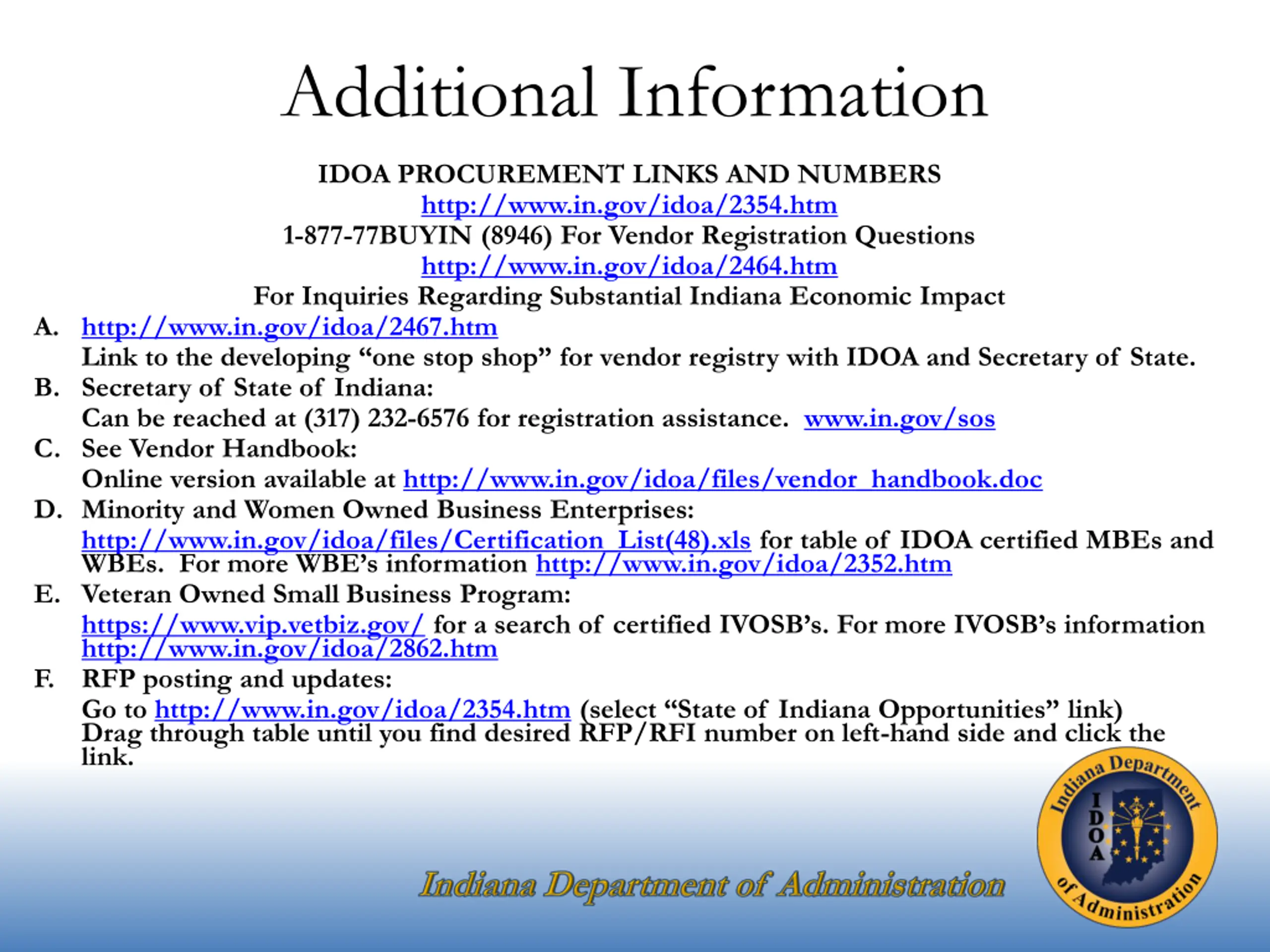 Additional Information IDOA PROCUREMENT LINKS AND NUMBERS http://www.in.gov/idoa/2354.htm 1-877-77BUYIN (8946) For Vendor Registration Questions http://www.in.gov/idoa/2464.htm For Inquiries Regarding Substantial Indiana Economic Impact A. http://www.in.gov/idoa/2467.htm Link to the developing one stop shop for vendor registry with IDOA and Secretary of State. B. Secretary of State of Indiana: Can be reached at (317) 232-6576 for registration assistance. www.in.gov/sos C. See Vendor Handbook: Online version available at http://www.in.gov/idoa/files/vendor_handbook.doc D. Minority and Women Owned Business Enterprises: http://www.in.gov/idoa/files/Certification_List(48).xls for table of IDOA certified MBEs and WBEs. For more WBE s information http://www.in.gov/idoa/2352.htm E. Veteran Owned Small Business Program: https://www.vip.vetbiz.gov/ for a search of certified IVOSB s. For more IVOSB s information http://www.in.gov/idoa/2862.htm F. RFP posting and updates: Go to http://www.in.gov/idoa/2354.htm (select State of Indiana Opportunities link) Drag through table until you find desired RFP/RFI number on left-hand side and click the link.