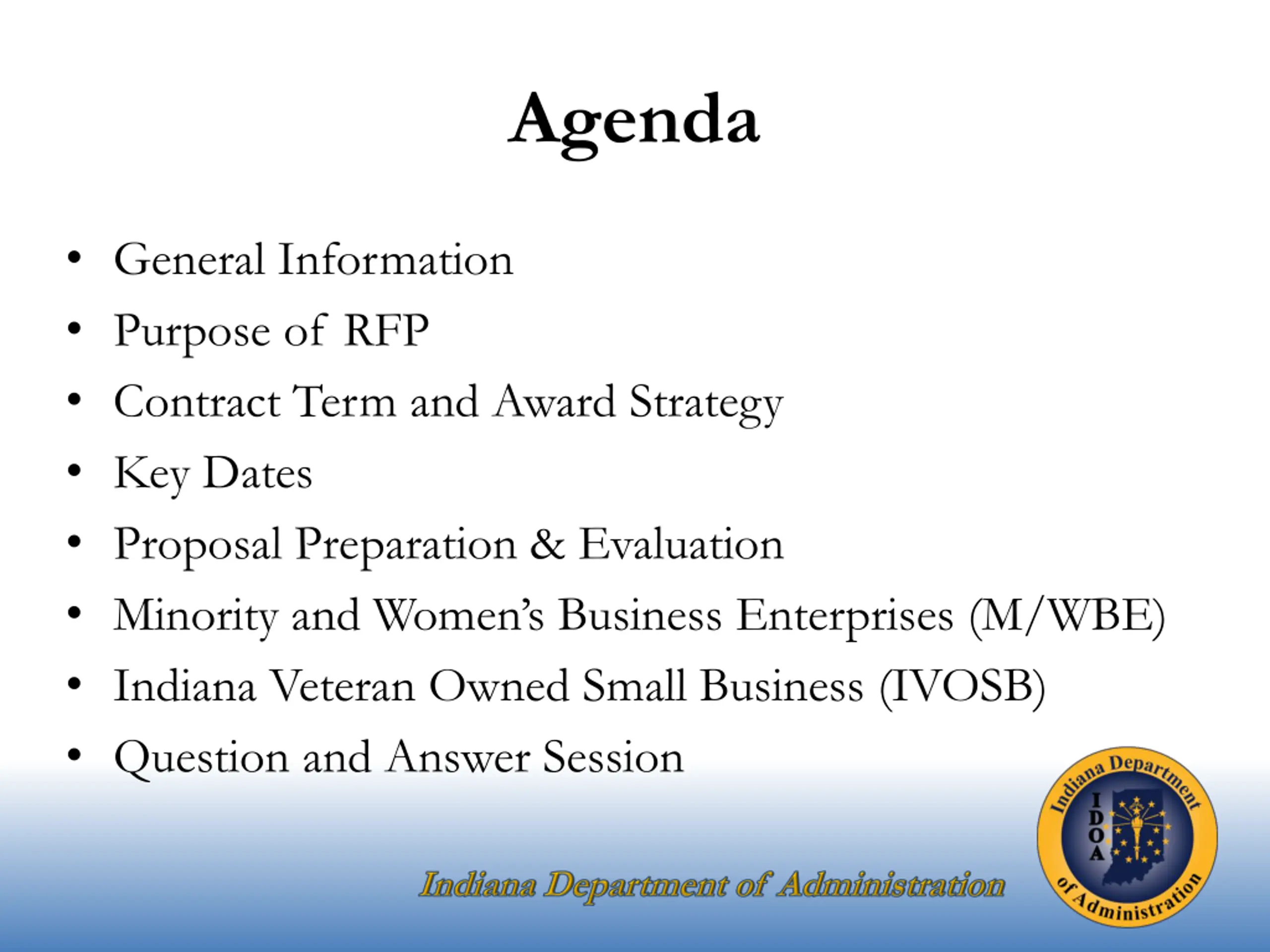 Agenda General Information Purpose of RFP Contract Term and Award Strategy Key Dates Proposal Preparation & Evaluation Minority and Women s Business Enterprises (M/WBE) Indiana Veteran Owned Small Business (IVOSB) Question and Answer Session