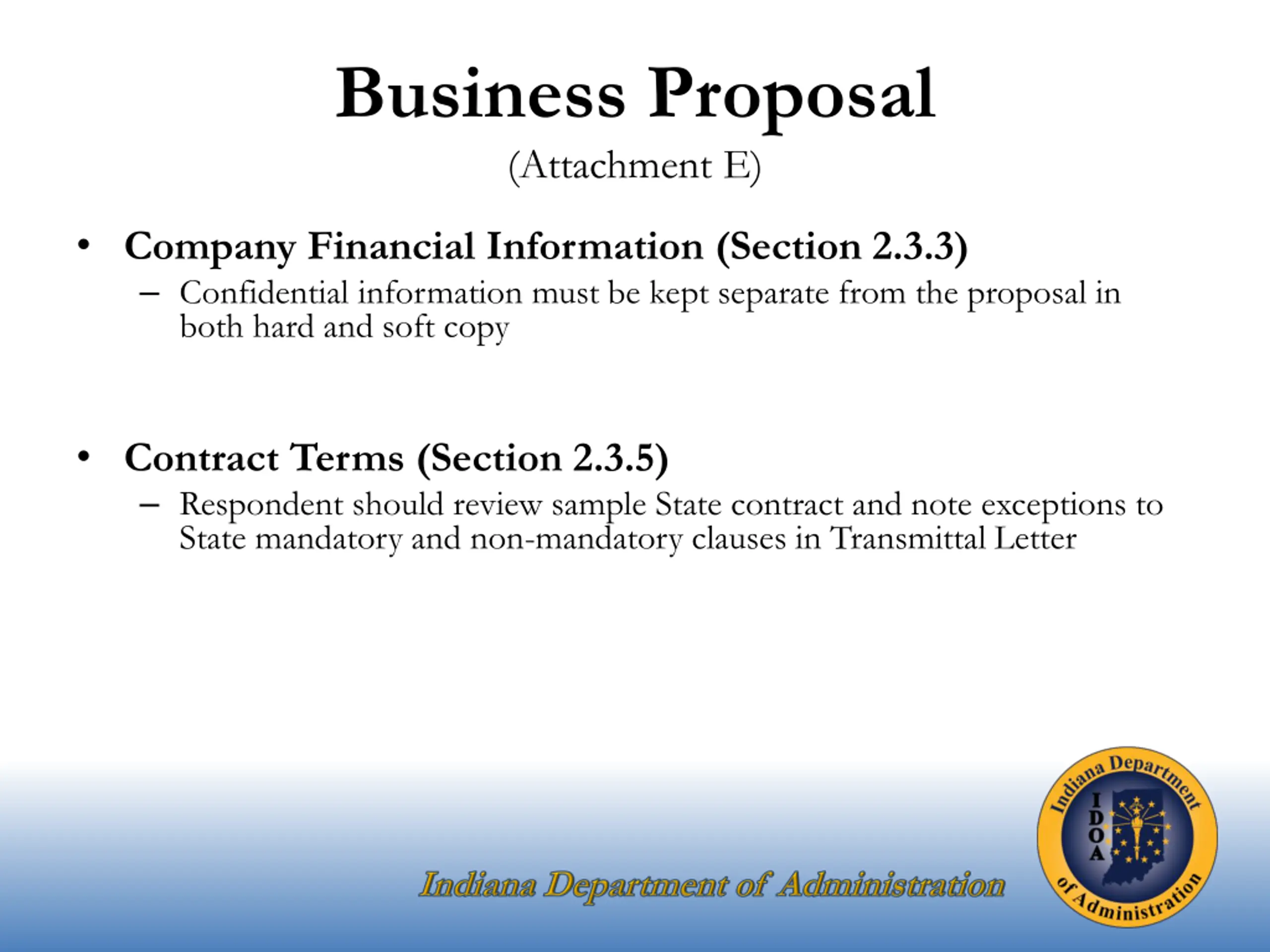 Business Proposal (Attachment E) Company Financial Information (Section 2.3.3) Confidential information must be kept separate from the proposal in both hard and soft copy Contract Terms (Section 2.3.5) Respondent should review sample State contract and note exceptions to State mandatory and non-mandatory clauses in Transmittal Letter