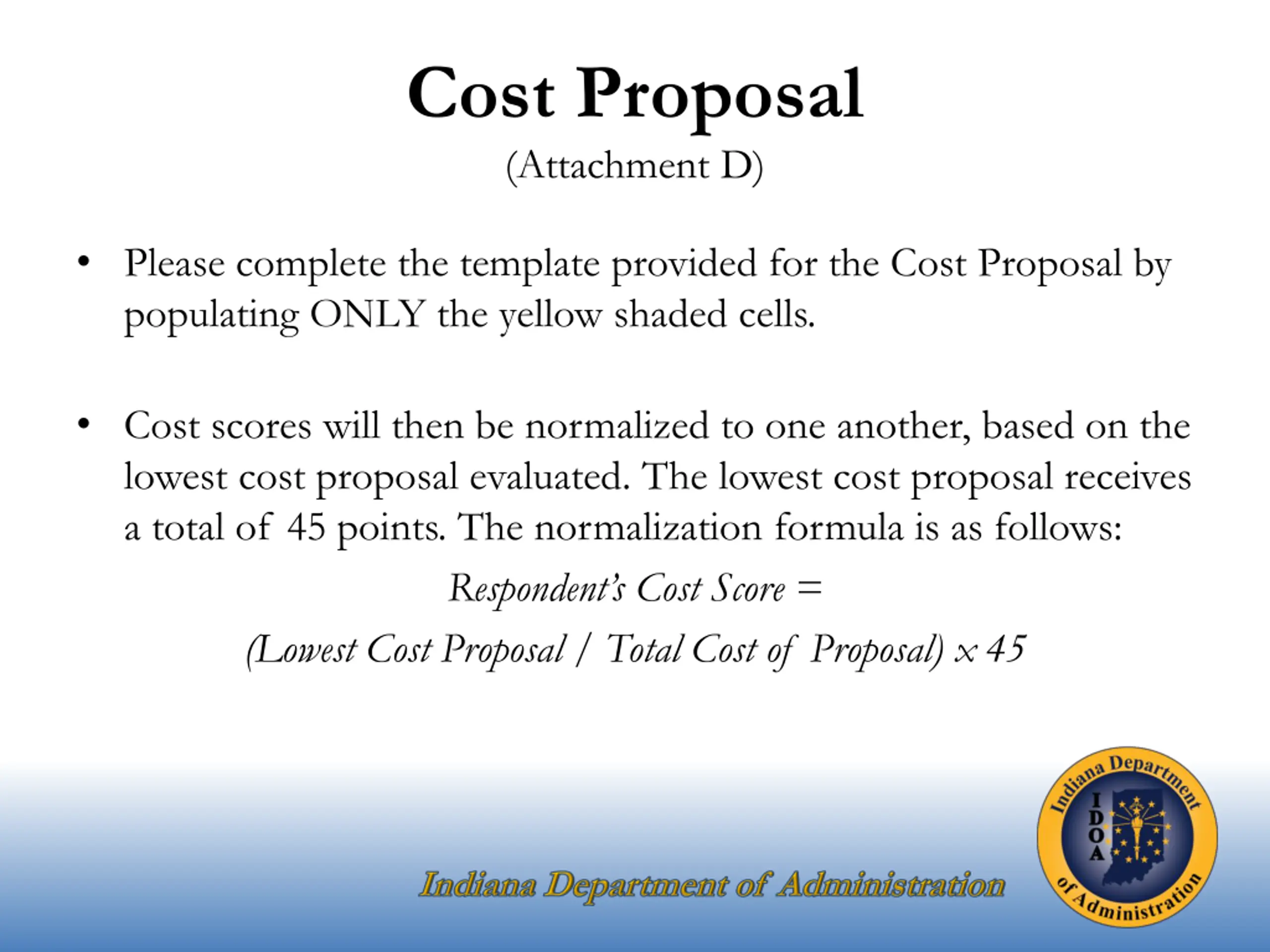 Cost Proposal (Attachment D) Please complete the template provided for the Cost Proposal by populating ONLY the yellow shaded cells. Cost scores will then be normalized to one another, based on the lowest cost proposal evaluated. The lowest cost proposal receives a total of 45 points. The normalization formula is as follows: Respondent s Cost Score = (Lowest Cost Proposal / Total Cost of Proposal) x 45