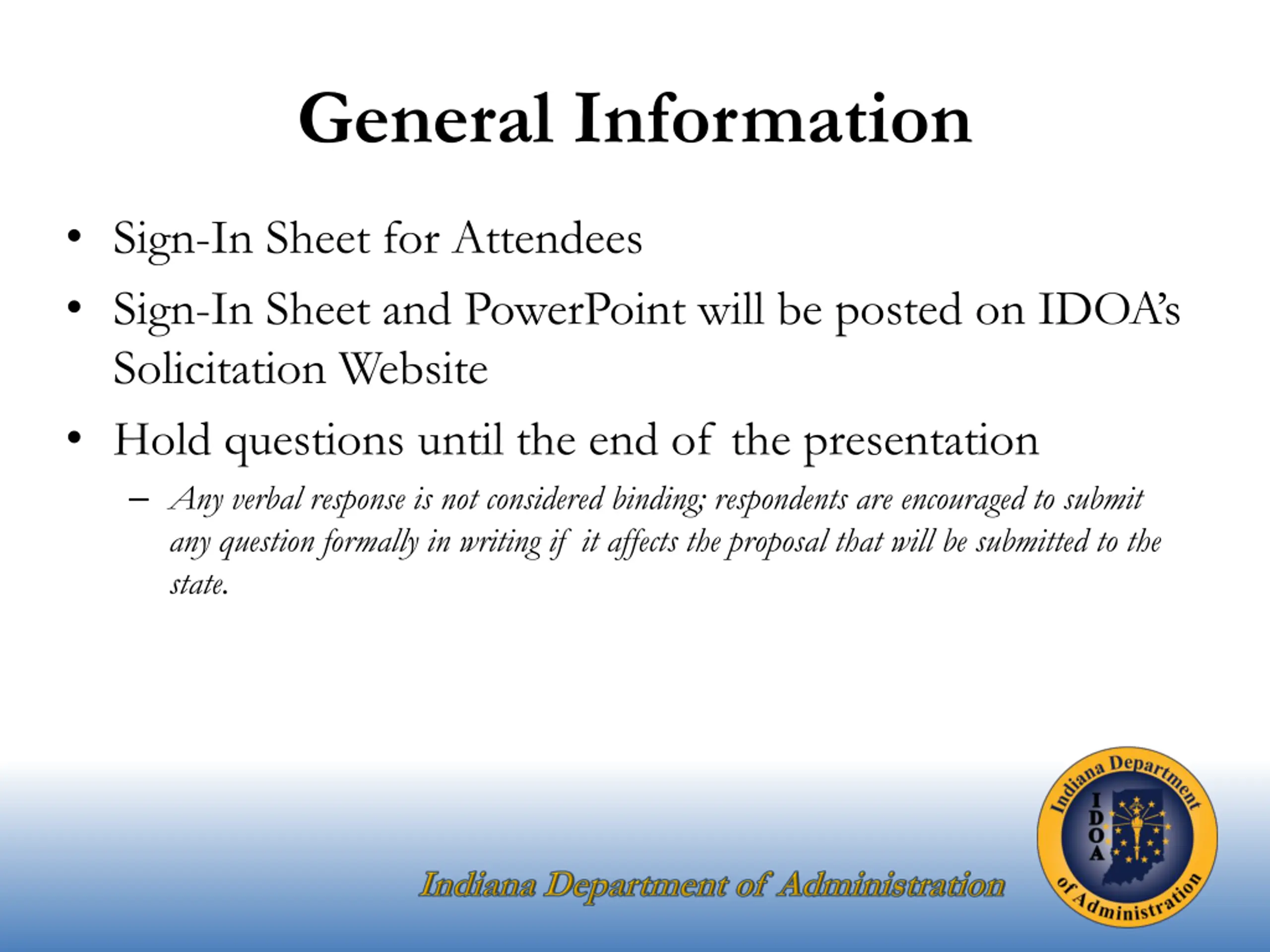 General Information Sign-In Sheet for Attendees Sign-In Sheet and PowerPoint will be posted on IDOA s Solicitation Website Hold questions until the end of the presentation Any verbal response is not considered binding; respondents are encouraged to submit any question formally in writing if it affects the proposal that will be submitted to the state.