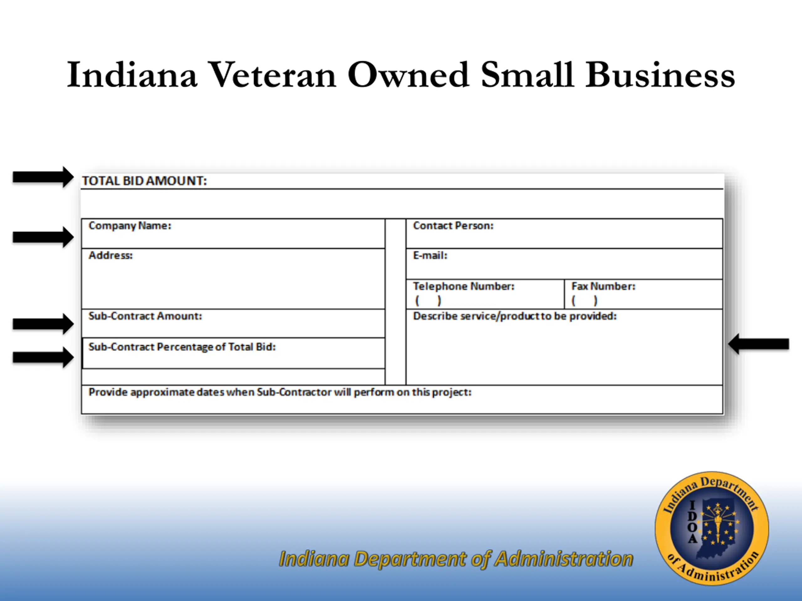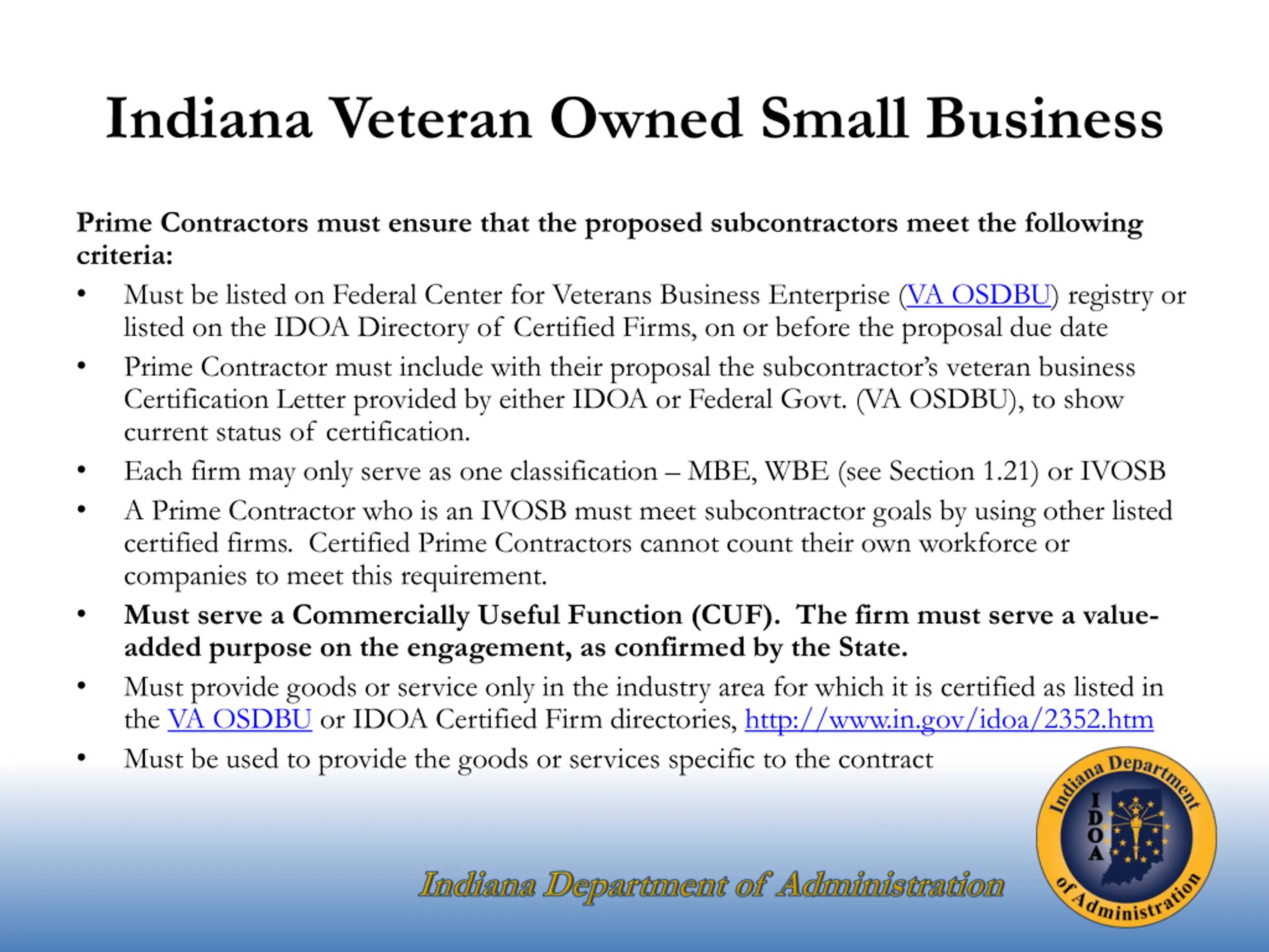 Indiana Veteran Owned Small Business Prime Contractors must ensure that the proposed subcontractors meet the following criteria: Must be listed on Federal Center for Veterans Business Enterprise (VA OSDBU) registry or listed on the IDOA Directory of Certified Firms, on or before the proposal due date Prime Contractor must include with their proposal the subcontractor s veteran business Certification Letter provided by either IDOA or Federal Govt. (VA OSDBU), to show current status of certification. Each firm may only serve as one classification MBE, WBE (see Section 1.21) or IVOSB A Prime Contractor who is an IVOSB must meet subcontractor goals by using other listed certified firms. Certified Prime Contractors cannot count their own workforce or companies to meet this requirement. Must serve a Commercially Useful Function (CUF). The firm must serve a value- added purpose on the engagement, as confirmed by the State. Must provide goods or service only in the industry area for which it is certified as listed in the VA OSDBU or IDOA Certified Firm directories, http://www.in.gov/idoa/2352.htm Must be used to provide the goods or services specific to the contract