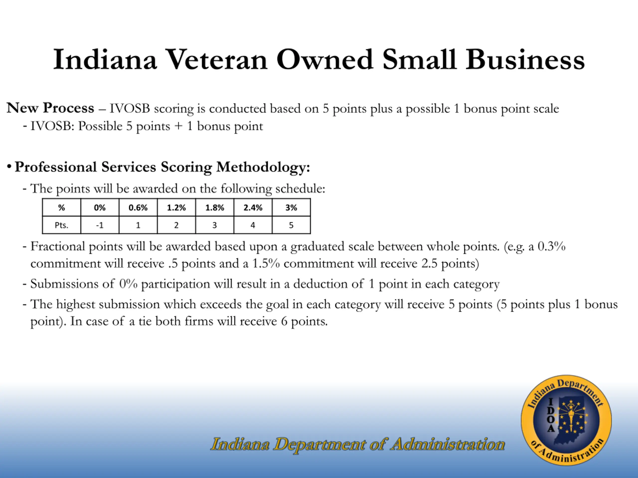 Indiana Veteran Owned Small Business New Process IVOSB scoring is conducted based on 5 points plus a possible 1 bonus point scale - IVOSB: Possible 5 points + 1 bonus point Professional Services Scoring Methodology: - The points will be awarded on the following schedule: % 0% 0.6% 1.2% 1.8% 2.4% 3% Pts. -1 1 2 3 4 5 - Fractional points will be awarded based upon a graduated scale between whole points. (e.g. a 0.3% commitment will receive .5 points and a 1.5% commitment will receive 2.5 points) - Submissions of 0% participation will result in a deduction of 1 point in each category - The highest submission which exceeds the goal in each category will receive 5 points (5 points plus 1 bonus point). In case of a tie both firms will receive 6 points.