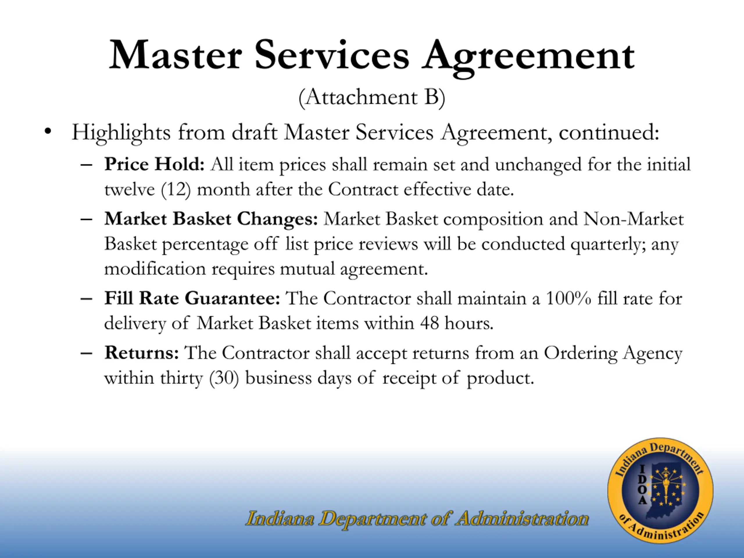 Master Services Agreement (Attachment B) Highlights from draft Master Services Agreement, continued: Price Hold: All item prices shall remain set and unchanged for the initial twelve (12) month after the Contract effective date. Market Basket Changes: Market Basket composition and Non-Market Basket percentage off list price reviews will be conducted quarterly; any modification requires mutual agreement. Fill Rate Guarantee: The Contractor shall maintain a 100% fill rate for delivery of Market Basket items within 48 hours. Returns: The Contractor shall accept returns from an Ordering Agency within thirty (30) business days of receipt of product.