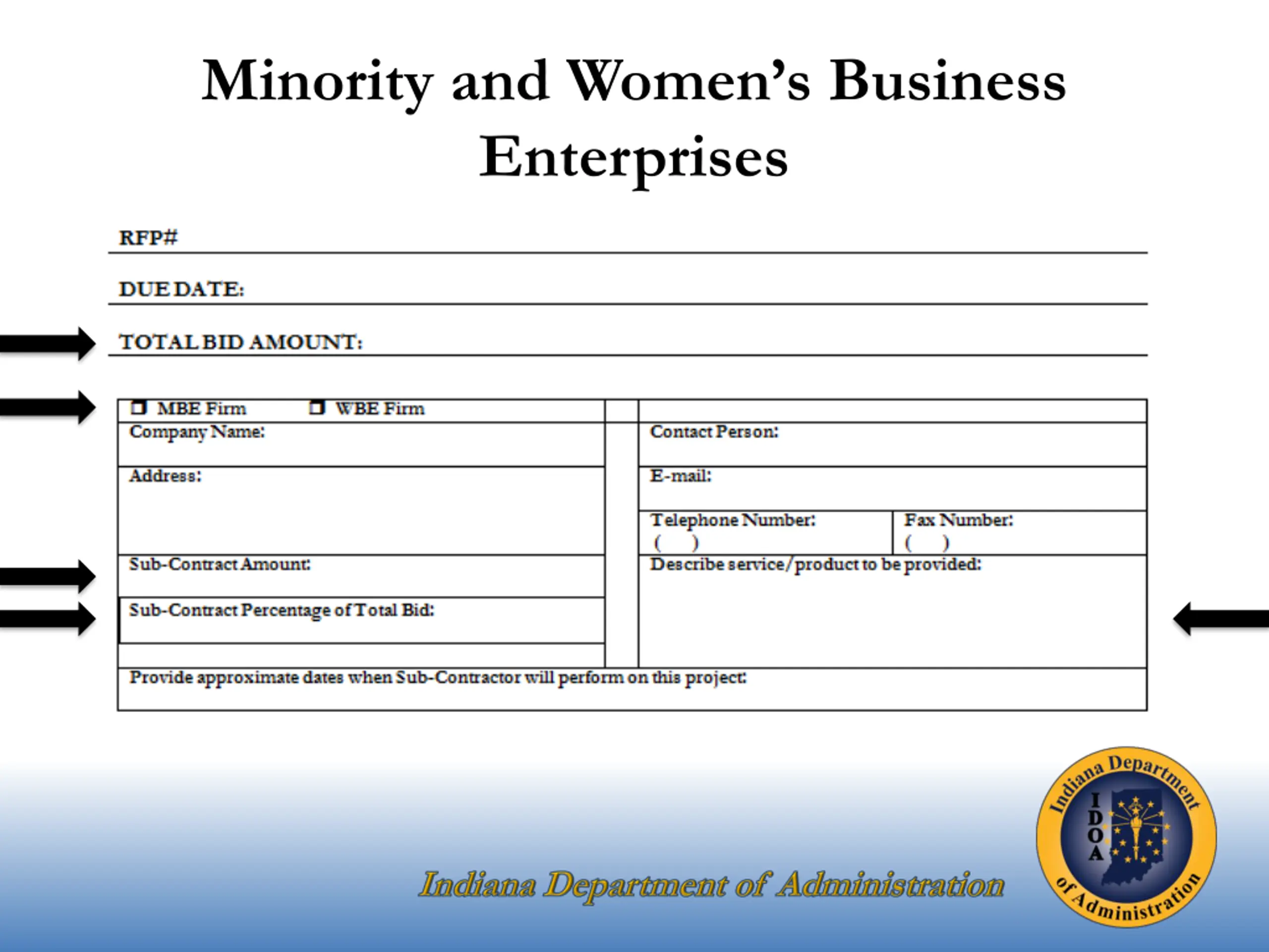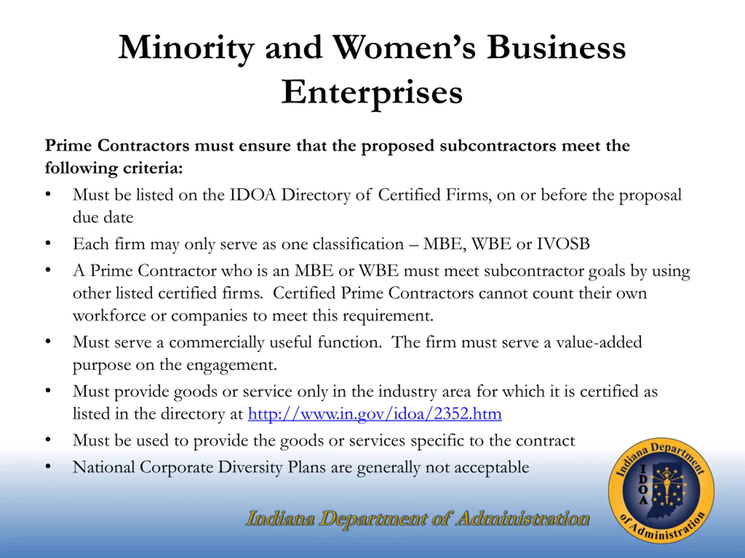 Minority and Womens Business Enterprises Prime Contractors must ensure that the proposed subcontractors meet the following criteria: Must be listed on the IDOA Directory of Certified Firms, on or before the proposal due date Each firm may only serve as one classification MBE, WBE or IVOSB A Prime Contractor who is an MBE or WBE must meet subcontractor goals by using other listed certified firms. Certified Prime Contractors cannot count their own workforce or companies to meet this requirement. Must serve a commercially useful function. The firm must serve a value-added purpose on the engagement. Must provide goods or service only in the industry area for which it is certified as listed in the directory at http://www.in.gov/idoa/2352.htm Must be used to provide the goods or services specific to the contract National Corporate Diversity Plans are generally not acceptable