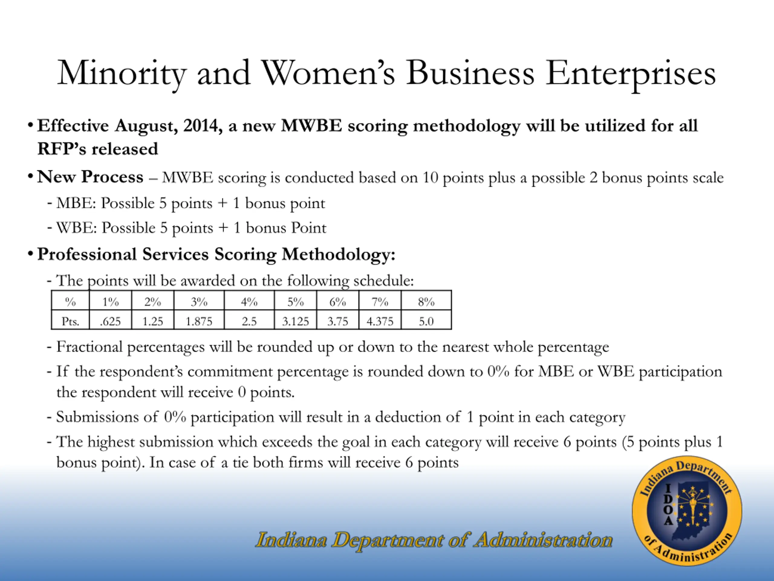 Minority and Womens Business Enterprises Effective August, 2014, a new MWBE scoring methodology will be utilized for all RFP s released New Process MWBE scoring is conducted based on 10 points plus a possible 2 bonus points scale - MBE: Possible 5 points + 1 bonus point - WBE: Possible 5 points + 1 bonus Point Professional Services Scoring Methodology: - The points will be awarded on the following schedule: % 1% 2% 3% 4% 5% 6% 7% Pts. .625 1.25 1.875 2.5 3.125 3.75 4.375 8% 5.0 - Fractional percentages will be rounded up or down to the nearest whole percentage - If the respondent s commitment percentage is rounded down to 0% for MBE or WBE participation the respondent will receive 0 points. - Submissions of 0% participation will result in a deduction of 1 point in each category - The highest submission which exceeds the goal in each category will receive 6 points (5 points plus 1 bonus point). In case of a tie both firms will receive 6 points