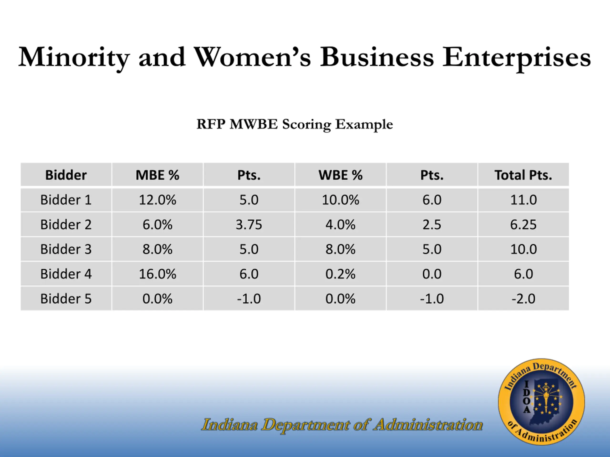 Minority and Womens Business Enterprises RFP MWBE Scoring Example Bidder MBE % Pts. WBE % Pts. Total Pts. Bidder 1 12.0% 5.0 10.0% 6.0 11.0 Bidder 2 6.0% 3.75 4.0% 2.5 6.25 Bidder 3 8.0% 5.0 8.0% 5.0 10.0 Bidder 4 16.0% 6.0 0.2% 0.0 6.0 Bidder 5 0.0% -1.0 0.0% -1.0 -2.0