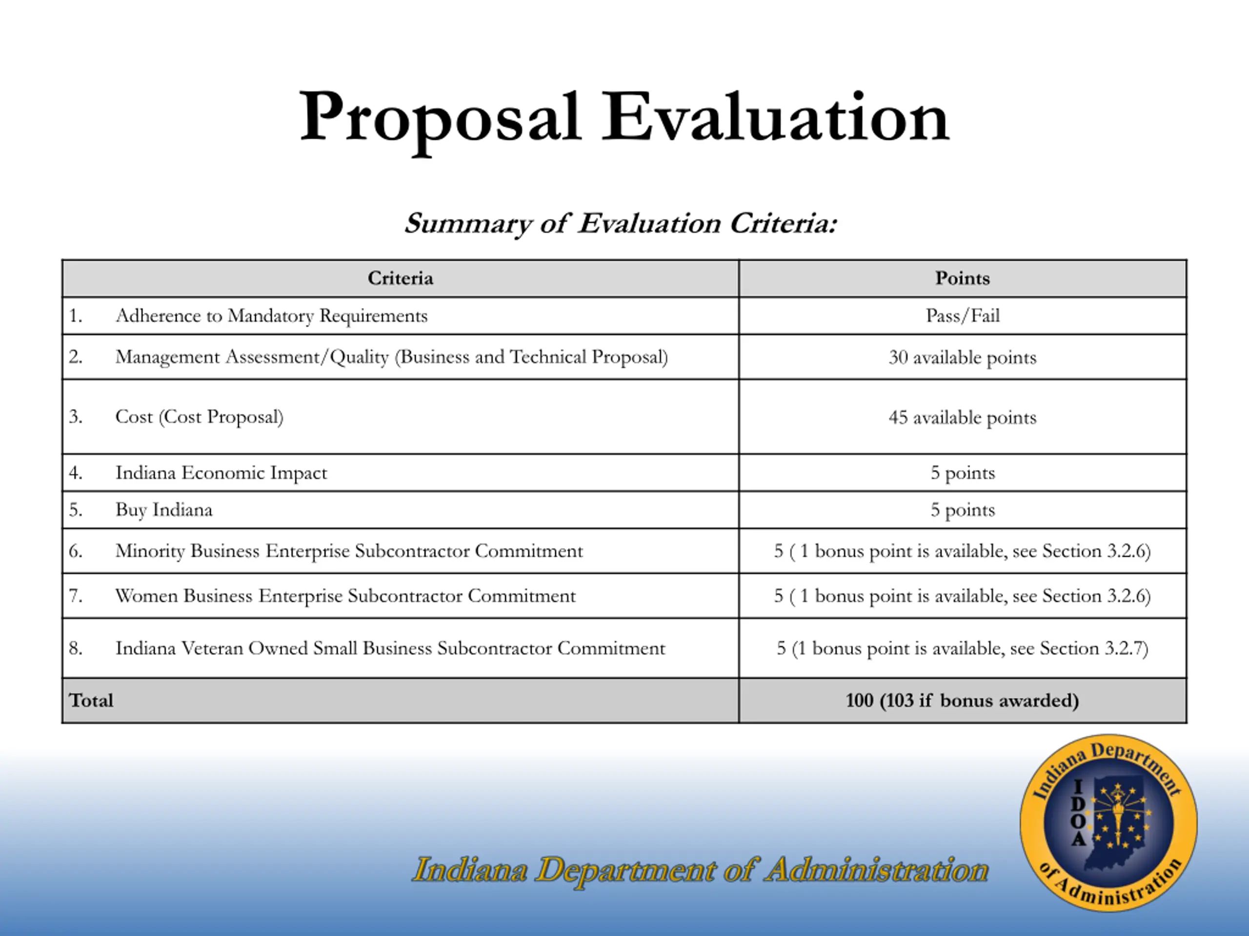Proposal Evaluation Summary of Evaluation Criteria: Criteria Points 1. Adherence to Mandatory Requirements Pass/Fail 2. Management Assessment/Quality (Business and Technical Proposal) 30 available points 3. Cost (Cost Proposal) 45 available points 4. Indiana Economic Impact 5 points 5. Buy Indiana 5 points 6. Minority Business Enterprise Subcontractor Commitment 5 ( 1 bonus point is available, see Section 3.2.6) 7. Women Business Enterprise Subcontractor Commitment 5 ( 1 bonus point is available, see Section 3.2.6) 8. Indiana Veteran Owned Small Business Subcontractor Commitment 5 (1 bonus point is available, see Section 3.2.7) Total 100 (103 if bonus awarded)