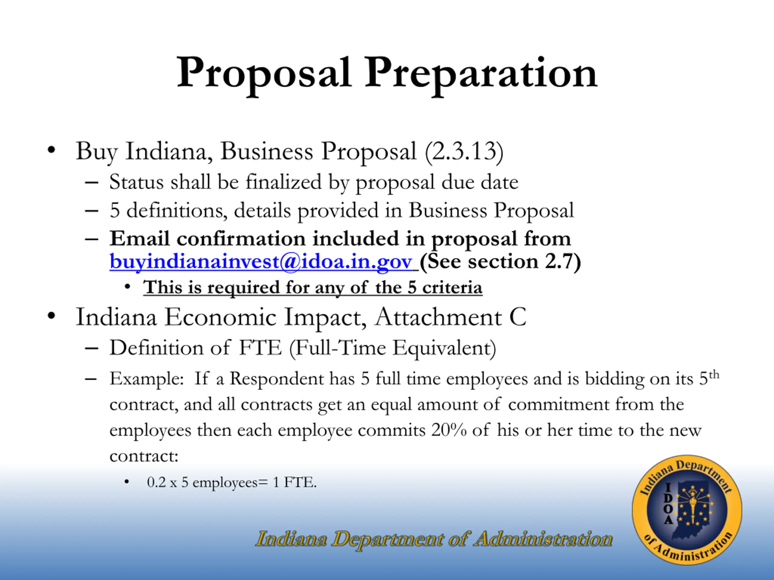 Proposal Preparation Buy Indiana, Business Proposal (2.3.13) Status shall be finalized by proposal due date 5 definitions, details provided in Business Proposal Email confirmation included in proposal from buyindianainvest@idoa.in.gov (See section 2.7) This is required for any of the 5 criteria Indiana Economic Impact, Attachment C Definition of FTE (Full-Time Equivalent) Example: If a Respondent has 5 full time employees and is bidding on its 5th contract, and all contracts get an equal amount of commitment from the employees then each employee commits 20% of his or her time to the new contract: 0.2 x 5 employees= 1 FTE.