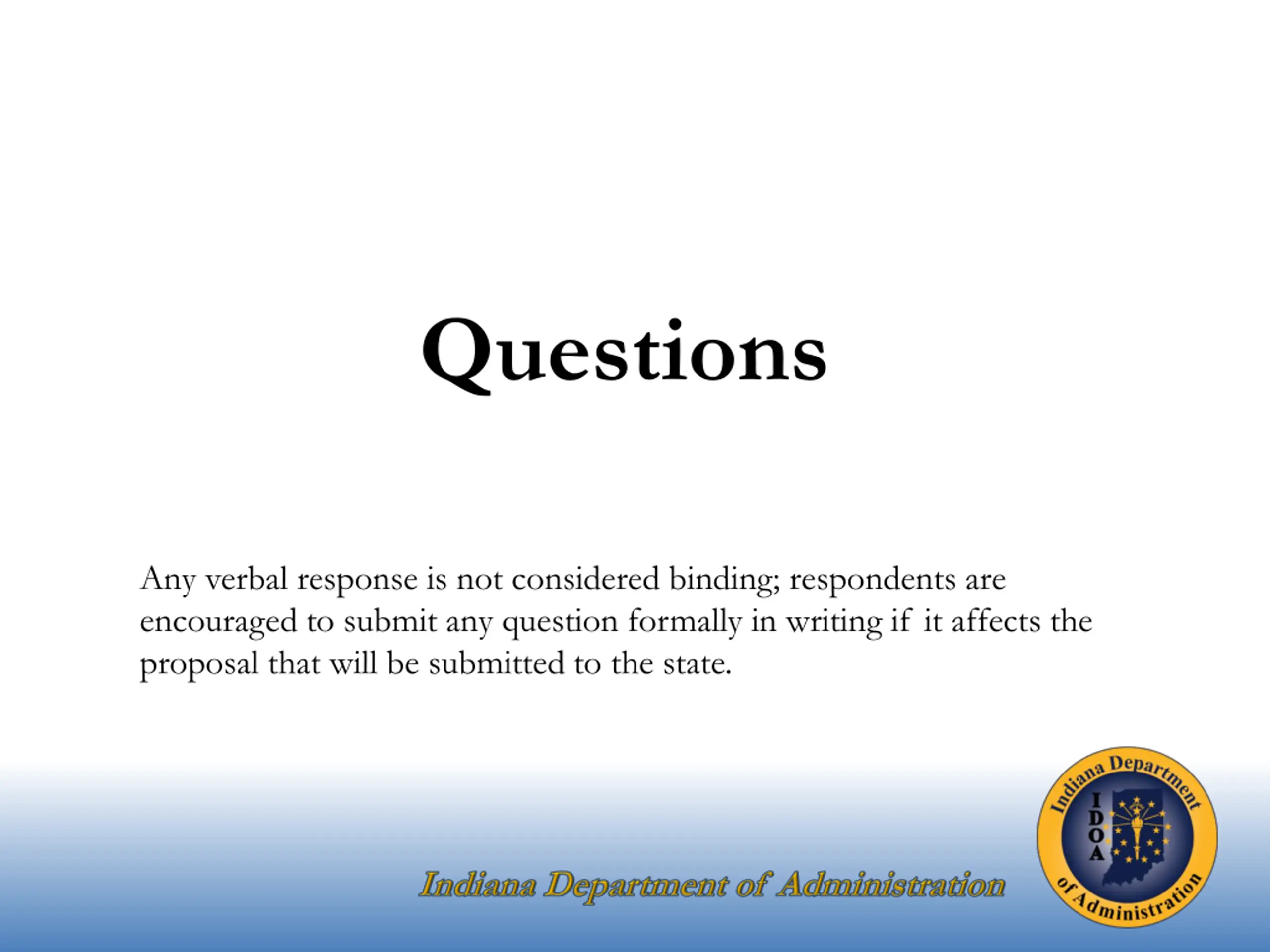 Questions Any verbal response is not considered binding; respondents are encouraged to submit any question formally in writing if it affects the proposal that will be submitted to the state.