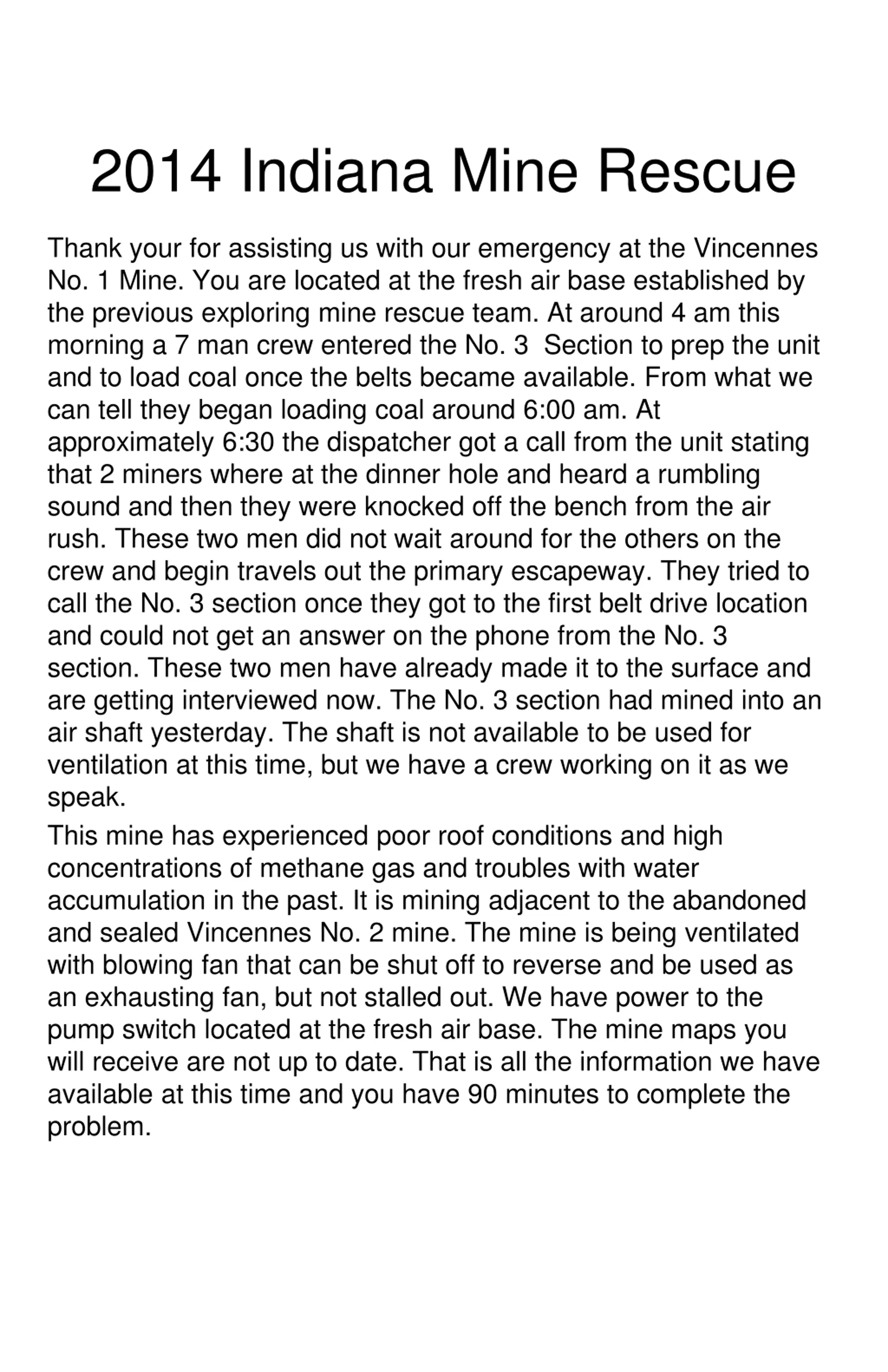 2014 Indiana Mine Rescue Thank your for assisting us with our emergency at the Vincennes No. 1 Mine. You are located at the fresh air base established by the previous exploring mine rescue team. At around 4 am this morning a 7 man crew entered the No. 3 Section to prep the unit and to load coal once the belts became available. From what we can tell they began loading coal around 6:00 am. At approximately 6:30 the dispatcher got a call from the unit stating that 2 miners where at the dinner hole and heard a rumbling sound and then they were knocked off the bench from the air rush. These two men did not wait around for the others on the crew and begin travels out the primary escapeway. They tried to call the No. 3 section once they got to the first belt drive location and could not get an answer on the phone from the No. 3 section. These two men have already made it to the surface and are getting interviewed now. The No. 3 section had mined into an air shaft yesterday. The shaft is not available to be used for ventilation at this time, but we have a crew working on it as we speak. This mine has experienced poor roof conditions and high concentrations of methane gas and troubles with water accumulation in the past. It is mining adjacent to the abandoned and sealed Vincennes No. 2 mine. The mine is being ventilated with blowing fan that can be shut off to reverse and be used as an exhausting fan, but not stalled out. We have power to the pump switch located at the fresh air base. The mine maps you will receive are not up to date. That is all the information we have available at this time and you have 90 minutes to complete the problem.