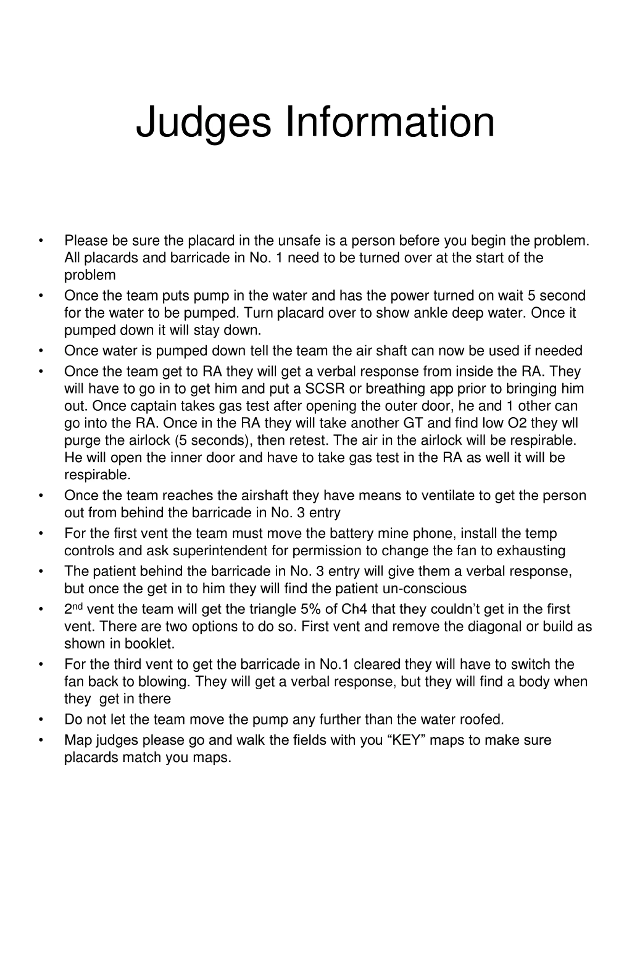 Judges Information Please be sure the placard in the unsafe is a person before you begin the problem. All placards and barricade in No. 1 need to be turned over at the start of the problem Once the team puts pump in the water and has the power turned on wait 5 second for the water to be pumped. Turn placard over to show ankle deep water. Once it pumped down it will stay down. Once water is pumped down tell the team the air shaft can now be used if needed Once the team get to RA they will get a verbal response from inside the RA. They will have to go in to get him and put a SCSR or breathing app prior to bringing him out. Once captain takes gas test after opening the outer door, he and 1 other can go into the RA. Once in the RA they will take another GT and find low O2 they wll purge the airlock (5 seconds), then retest. The air in the airlock will be respirable. He will open the inner door and have to take gas test in the RA as well it will be respirable. Once the team reaches the airshaft they have means to ventilate to get the person out from behind the barricade in No. 3 entry For the first vent the team must move the battery mine phone, install the temp controls and ask superintendent for permission to change the fan to exhausting The patient behind the barricade in No. 3 entry will give them a verbal response, but once the get in to him they will find the patient un-conscious 2ndvent the team will get the triangle 5% of Ch4 that they couldn t get in the first vent. There are two options to do so. First vent and remove the diagonal or build as shown in booklet. For the third vent to get the barricade in No.1 cleared they will have to switch the fan back to blowing. They will get a verbal response, but they will find a body when they get in there Do not let the team move the pump any further than the water roofed. Map judges please go and walk the fields with you KEY maps to make sure placards match you maps.