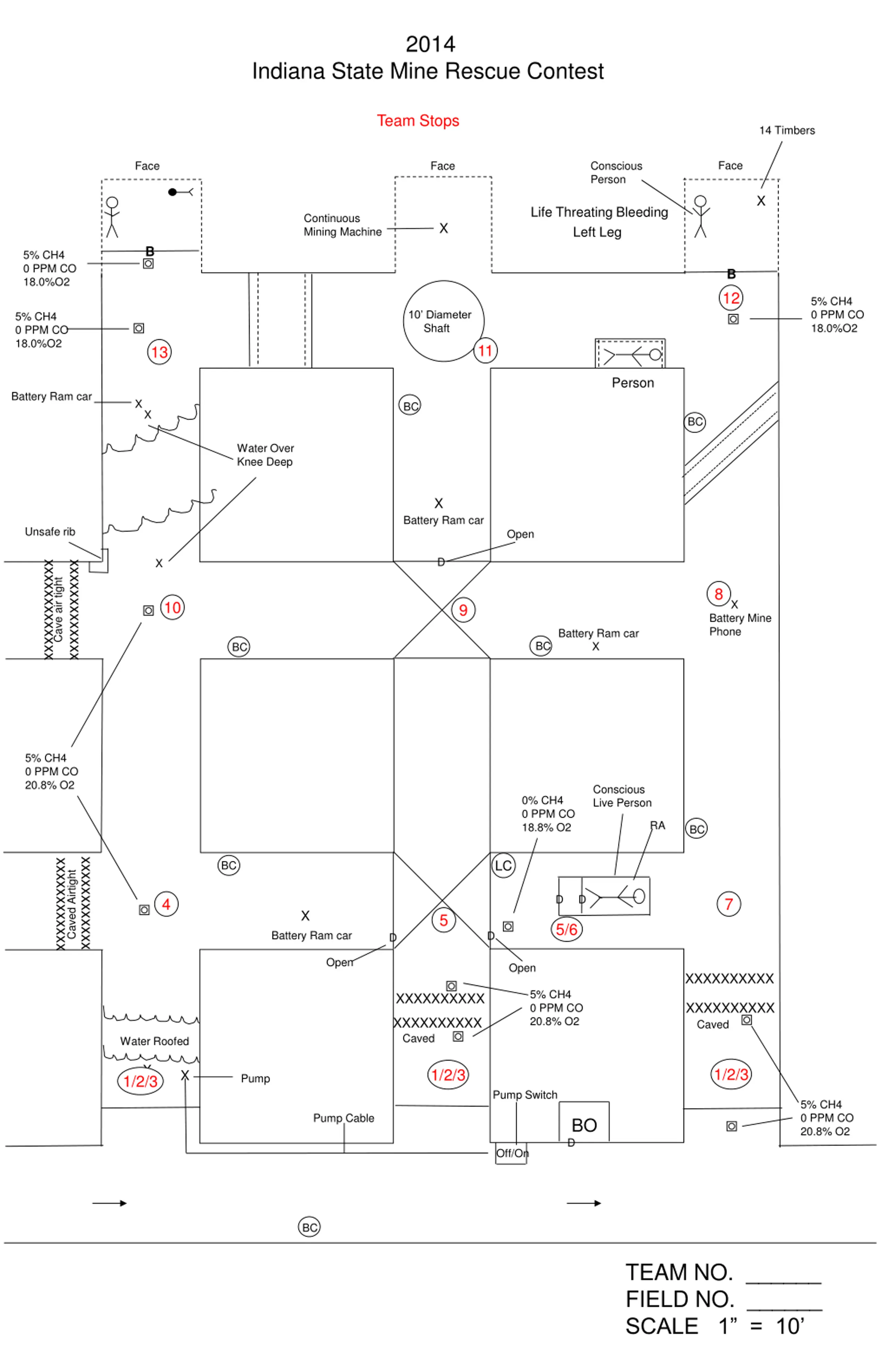 2014 Indiana State Mine Rescue Contest Team Stops 14 Timbers Face Face Face Conscious Person X Life Threating Bleeding Left Leg Continuous Mining Machine X B 5% CH4 0 PPM CO 18.0%O2 B 12 5% CH4 0 PPM CO 18.0%O2 10 Diameter Shaft 5% CH4 0 PPM CO 18.0%O2 11 13 Person Battery Ram car X BC X BC Water Over Knee Deep X Battery Ram car Unsafe rib Open D X xxxxxxxxxxxxx xxxxxxxxxxxxx Cave air tight 8 X 10 9 Battery Mine Phone Battery Ram car X BC BC 5% CH4 0 PPM CO 20.8% O2 Conscious Live Person 0% CH4 0 PPM CO 18.8% O2 RA BC xxxxxxxxxxxx xxxxxxxxxxxx LC BC Caved Airtight D D 4 7 X 5 5/6 Battery Ram car D D Open Open XXXXXXXXXX 5% CH4 0 PPM CO 20.8% O2 XXXXXXXXXX XXXXXXXXXX Caved XXXXXXXXXX Caved Water Roofed X 1/2/3 1/2/3 X Pump 1/2/3 Pump Switch 5% CH4 0 PPM CO 20.8% O2 Pump Cable BO D Off/On BC TEAM NO. ______ FIELD NO. ______ SCALE 1 = 10