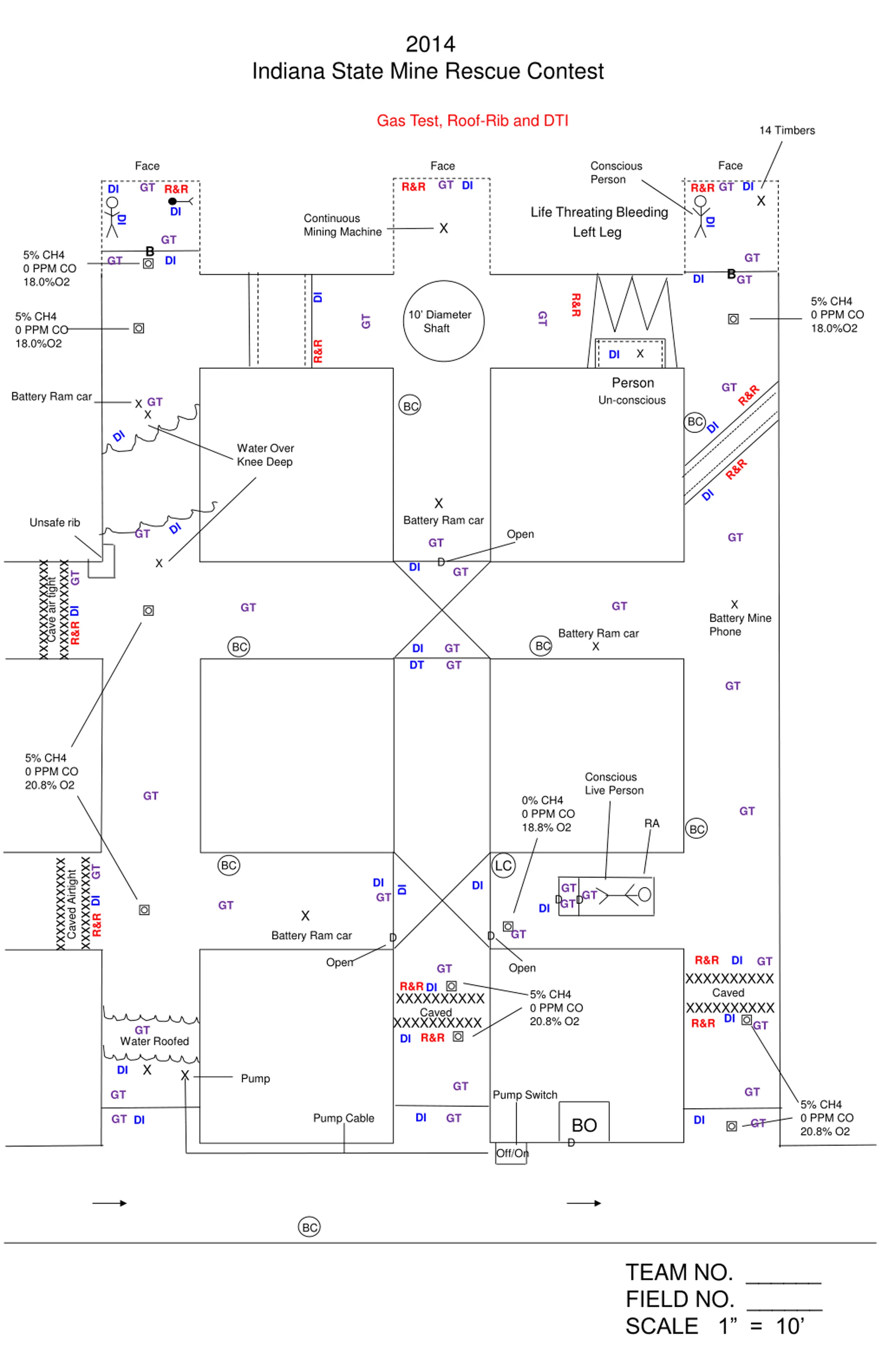 2014 Indiana State Mine Rescue Contest Gas Test, Roof-Rib and DTI 14 Timbers Face Face Face Conscious Person GT DI R&R GT DI R&R GT DI R&R X Life Threating Bleeding Left Leg DI Continuous Mining Machine DI DI X GT B 5% CH4 0 PPM CO 18.0%O2 GT DI GT B DI GT DI R&R 5% CH4 0 PPM CO 18.0%O2 10 Diameter Shaft 5% CH4 0 PPM CO 18.0%O2 GT GT R&R X DI Person Un-conscious GT Battery Ram car GT X BC X BC Water Over Knee Deep X Battery Ram car Unsafe rib GT Open GT GT D X xxxxxxxxxxxxx xxxxxxxxxxxxx DI GT GT Cave air tight X GT GT DI Battery Mine Phone R&R Battery Ram car X BC BC DI DT GT GT GT 5% CH4 0 PPM CO 20.8% O2 Conscious Live Person GT 0% CH4 0 PPM CO 18.8% O2 GT RA BC xxxxxxxxxxxx xxxxxxxxxxxx LC BC GT Caved Airtight DI DI GT GT DI GT GT D D R&R DI GT DI X GT Battery Ram car D D R&R DI GT Open Open GT XXXXXXXXXX Caved R&R DI 5% CH4 0 PPM CO 20.8% O2 XXXXXXXXXX Caved XXXXXXXXXX DI R&R XXXXXXXXXX DI R&R GT GT Water Roofed X DI X Pump GT GT Pump Switch GT 5% CH4 0 PPM CO 20.8% O2 DI Pump Cable GT GT DI DI BO D GT Off/On BC TEAM NO. ______ FIELD NO. ______ SCALE 1 = 10