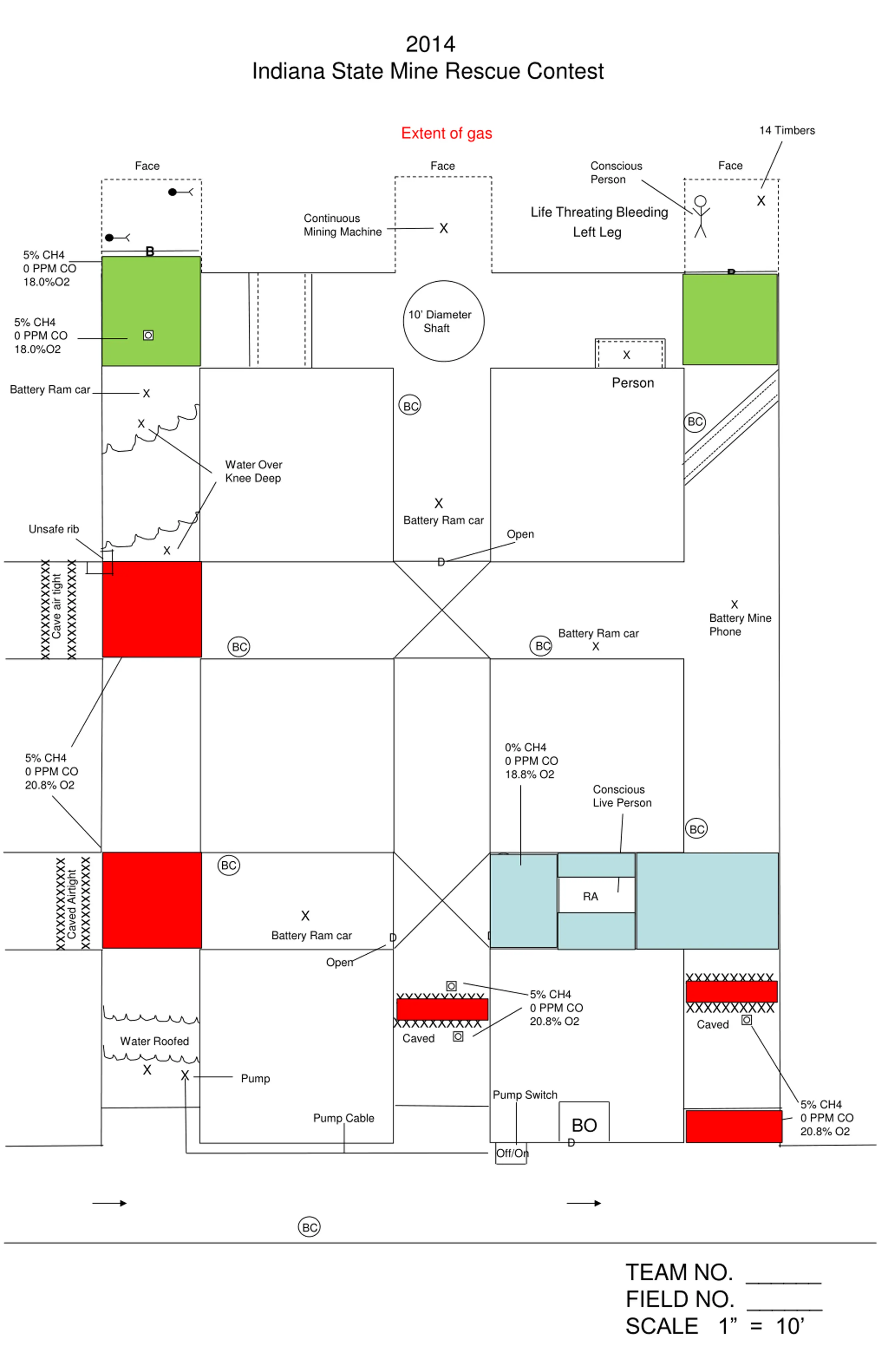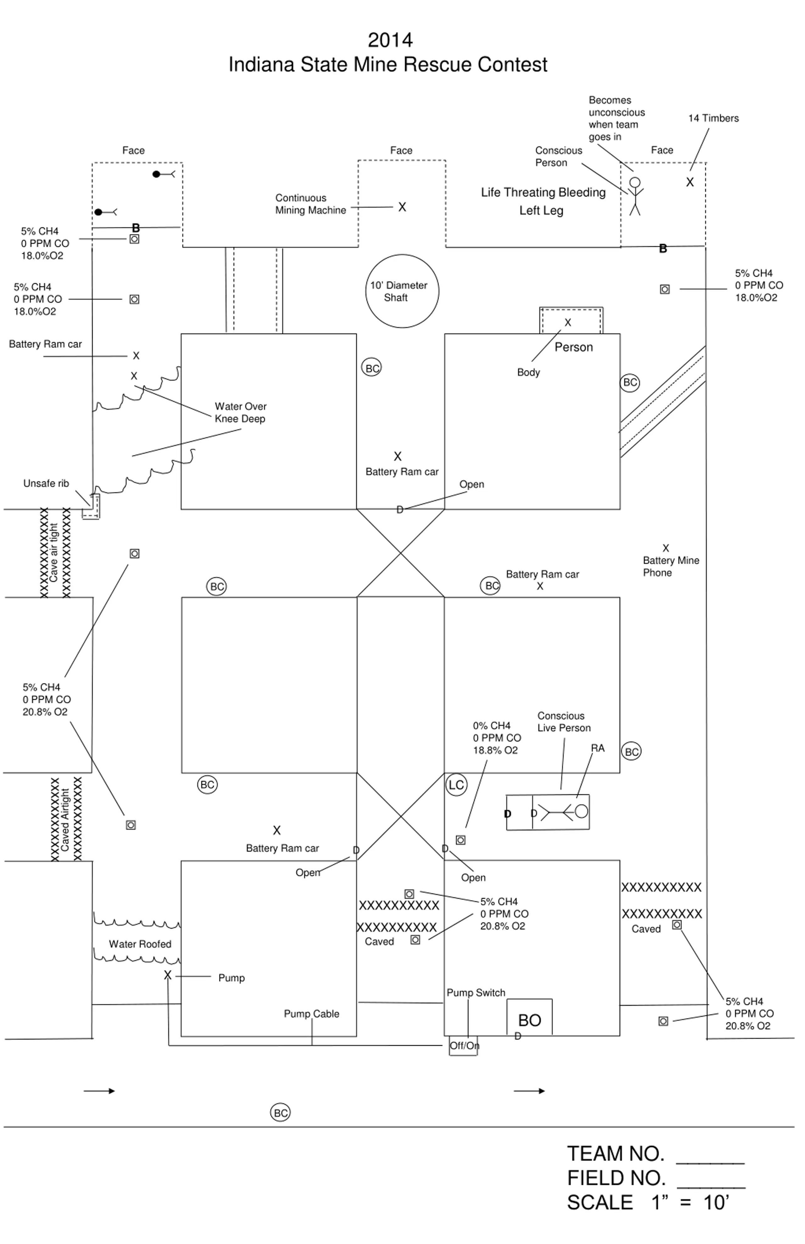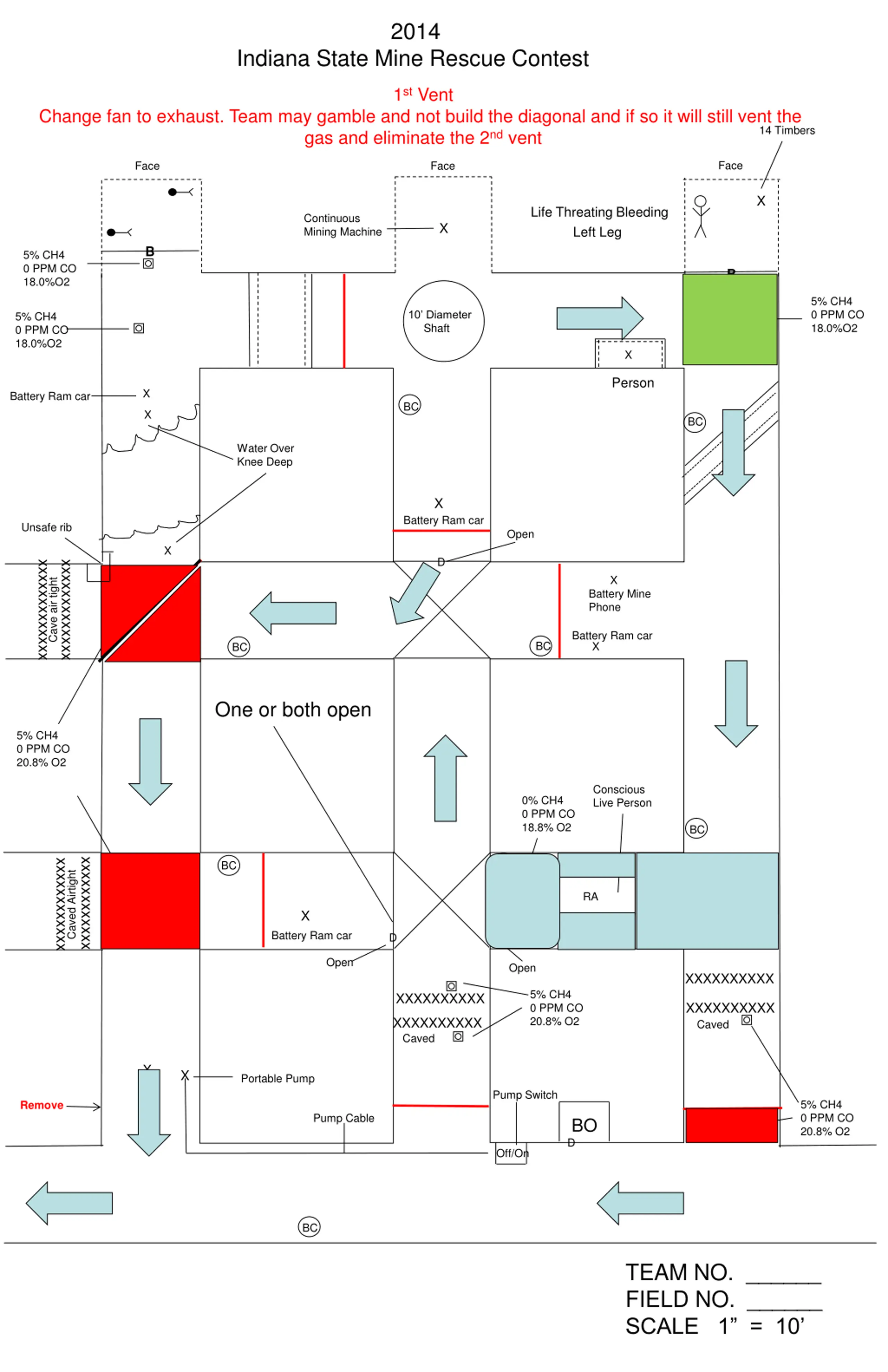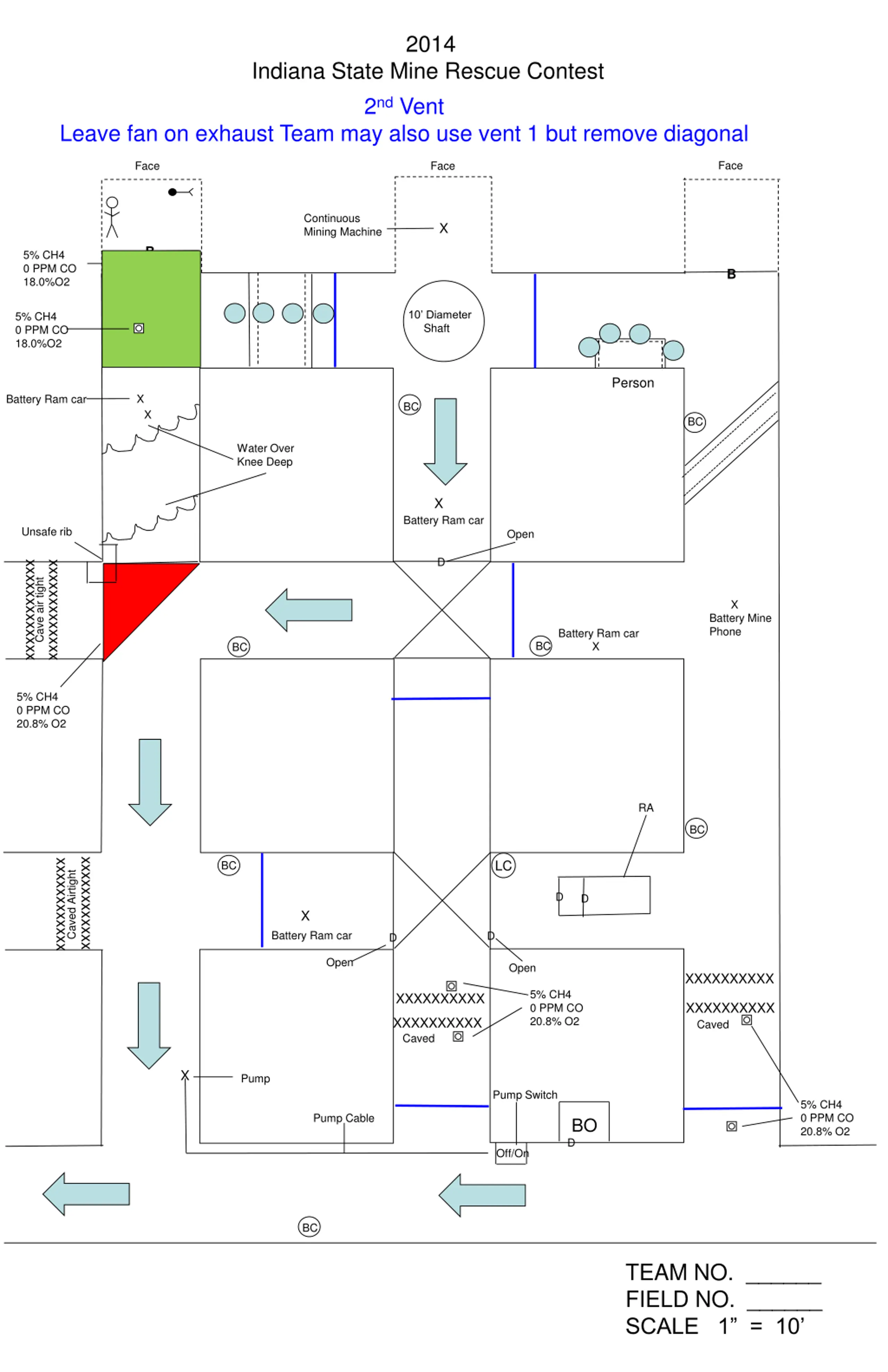2014 Indiana State Mine Rescue Contest 1st Vent Change fan to exhaust. Team may gamble and not build the diagonal and if so it will still vent the gas and eliminate the 2nd vent 14 Timbers Face Face Face X Life Threating Bleeding Left Leg Continuous Mining Machine X B 5% CH4 0 PPM CO 18.0%O2 B 5% CH4 0 PPM CO 18.0%O2 10 Diameter Shaft 5% CH4 0 PPM CO 18.0%O2 X Person X Battery Ram car BC X BC Water Over Knee Deep X Battery Ram car Unsafe rib Open X D xxxxxxxxxxxxx xxxxxxxxxxxxx X Cave air tight Battery Mine Phone Battery Ram car X BC BC One or both open 5% CH4 0 PPM CO 20.8% O2 Conscious Live Person 0% CH4 0 PPM CO 18.8% O2 BC xxxxxxxxxxxx xxxxxxxxxxxx LC BC Caved Airtight RA X D Battery Ram car D D Open Open XXXXXXXXXX 5% CH4 0 PPM CO 20.8% O2 XXXXXXXXXX XXXXXXXXXX Caved XXXXXXXXXX Caved X X Portable Pump Pump Switch 5% CH4 0 PPM CO 20.8% O2 Remove Pump Cable BO D Off/On BC TEAM NO. ______ FIELD NO. ______ SCALE 1 = 10