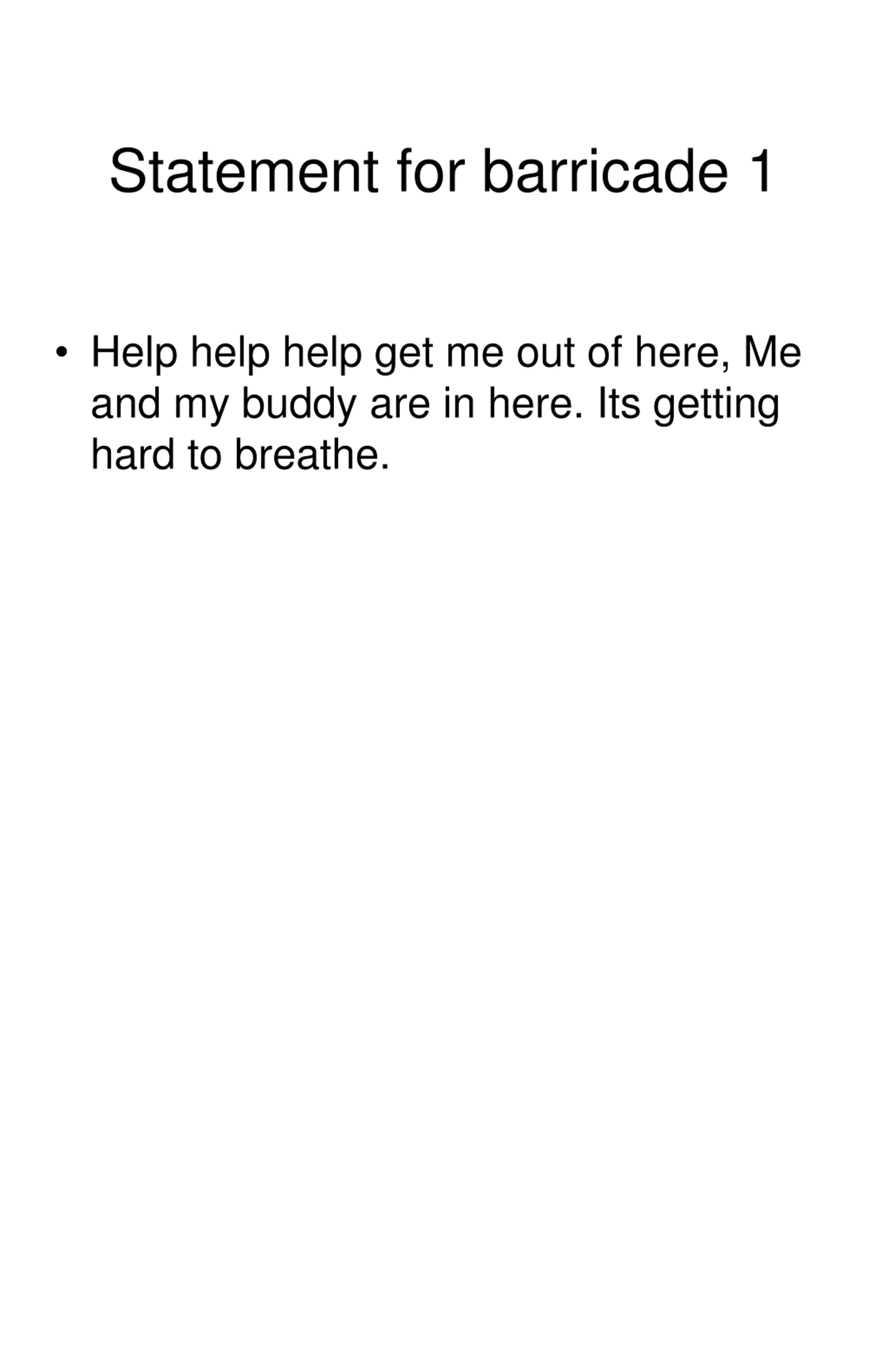 Statement for barricade 1 Help help help get me out of here, Me and my buddy are in here. Its getting hard to breathe.