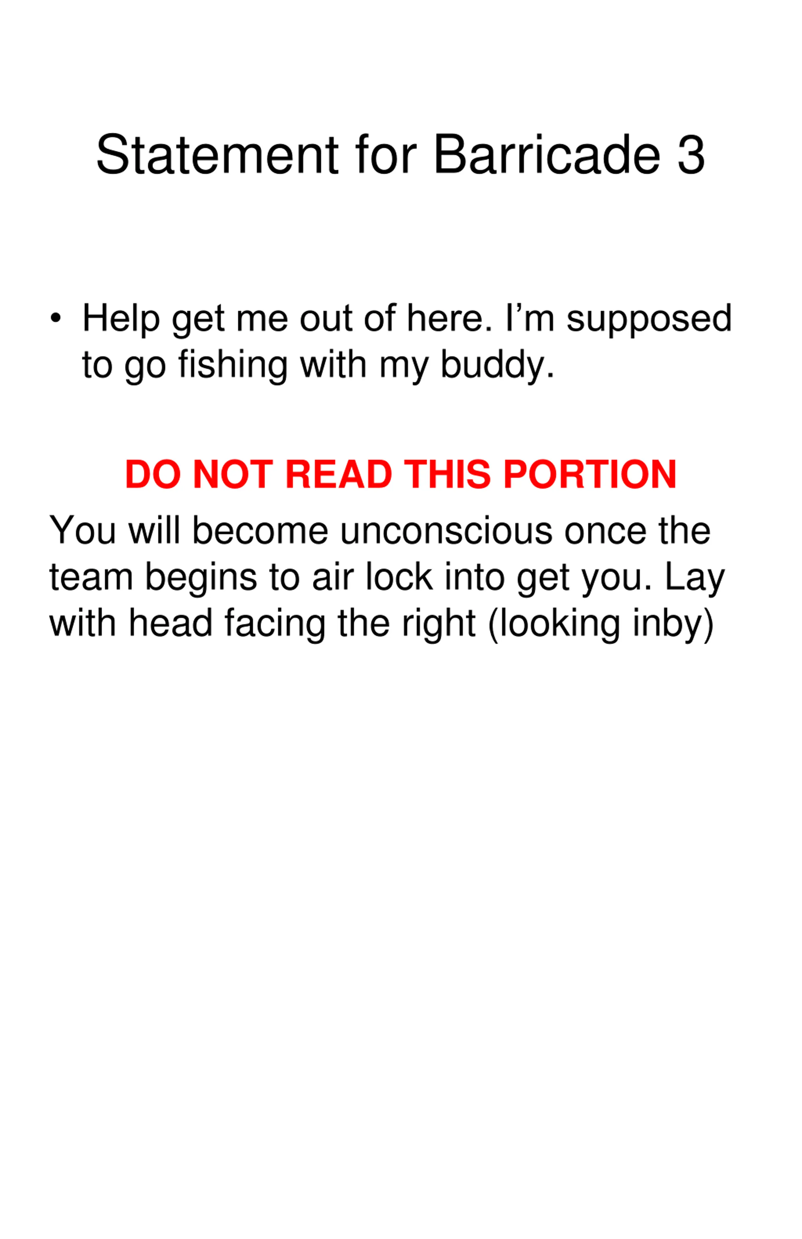 Statement for Barricade 3 Help get me out of here. I m supposed to go fishing with my buddy. DO NOT READ THIS PORTION You will become unconscious once the team begins to air lock into get you. Lay with head facing the right (looking inby)