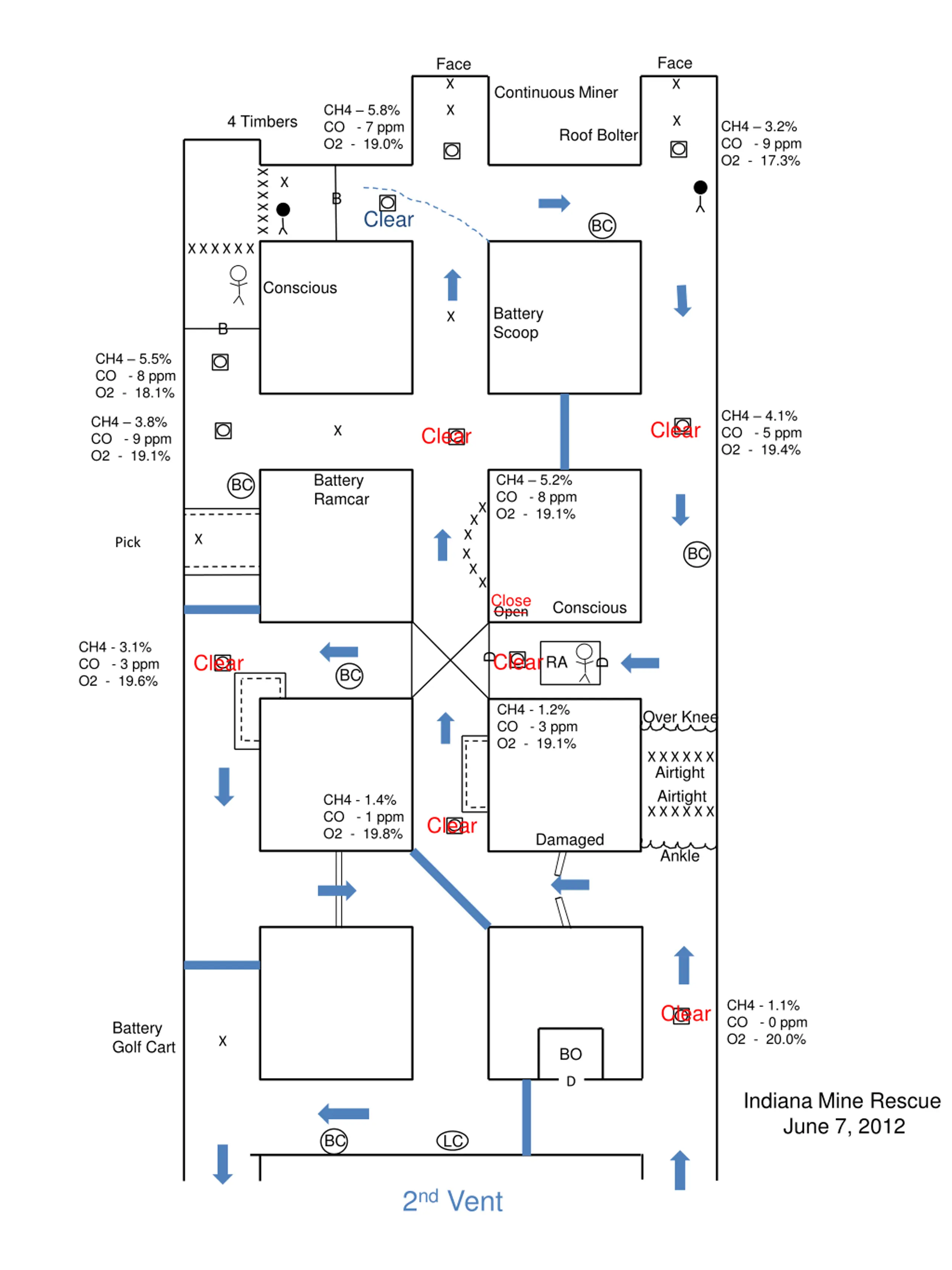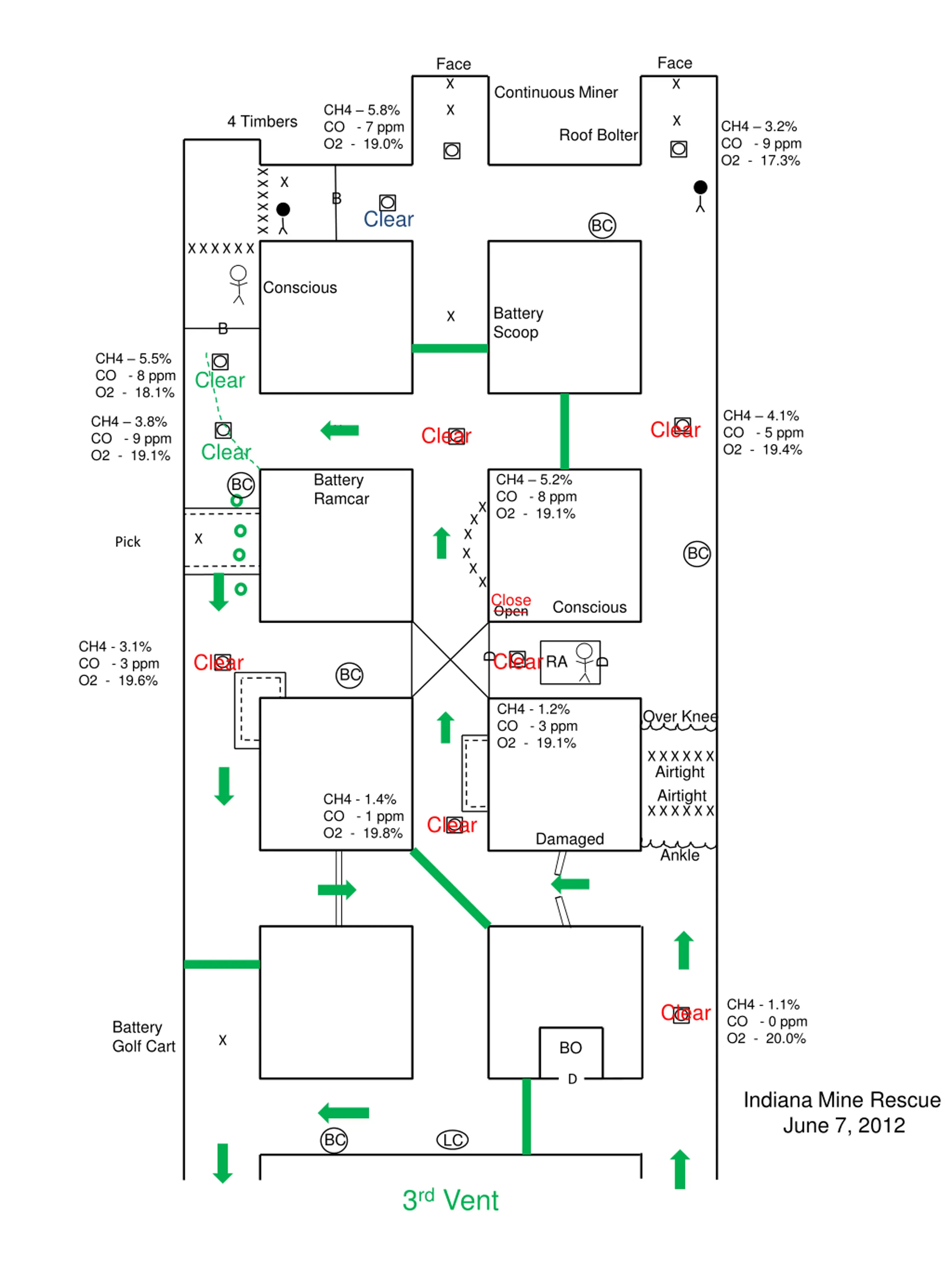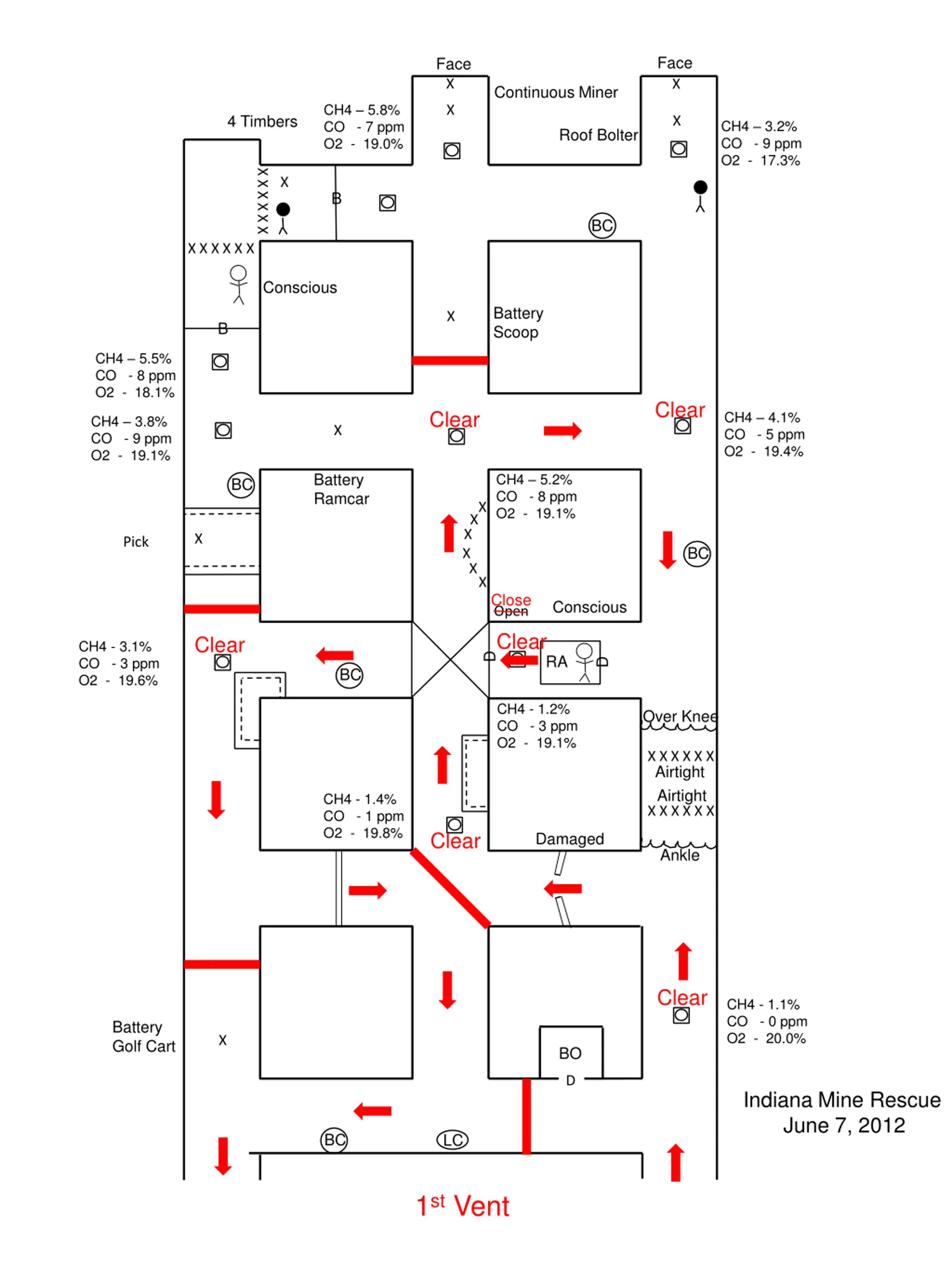 Face X Face X Continuous Miner CH4 5.8% CO - 7 ppm O2 - 19.0% X 4 Timbers X CH4 3.2% CO - 9 ppm O2 - 17.3% Roof Bolter X X X X X X X B Clear BC X X X X X X Conscious Battery Scoop X B CH4 5.5% CO - 8 ppm O2 - 18.1% CH4 4.1% CO - 5 ppm O2 - 19.4% CH4 3.8% CO - 9 ppm O2 - 19.1% Clear Clear X Battery Ramcar CH4 5.2% CO - 8 ppm O2 - 19.1% BC X X X X X Pick BC X X Close Conscious Open CH4 - 3.1% CO - 3 ppm O2 - 19.6% Clear Clear D RA D BC CH4 - 1.2% CO - 3 ppm O2 - 19.1% Over Knee X X X X X X Airtight Airtight CH4 - 1.4% CO - 1 ppm O2 - 19.8% X X X X X X Clear Damaged Ankle CH4 - 1.1% CO - 0 ppm O2 - 20.0% Clear Battery Golf Cart X BO D Indiana Mine Rescue June 7, 2012 BC LC 2nd Vent