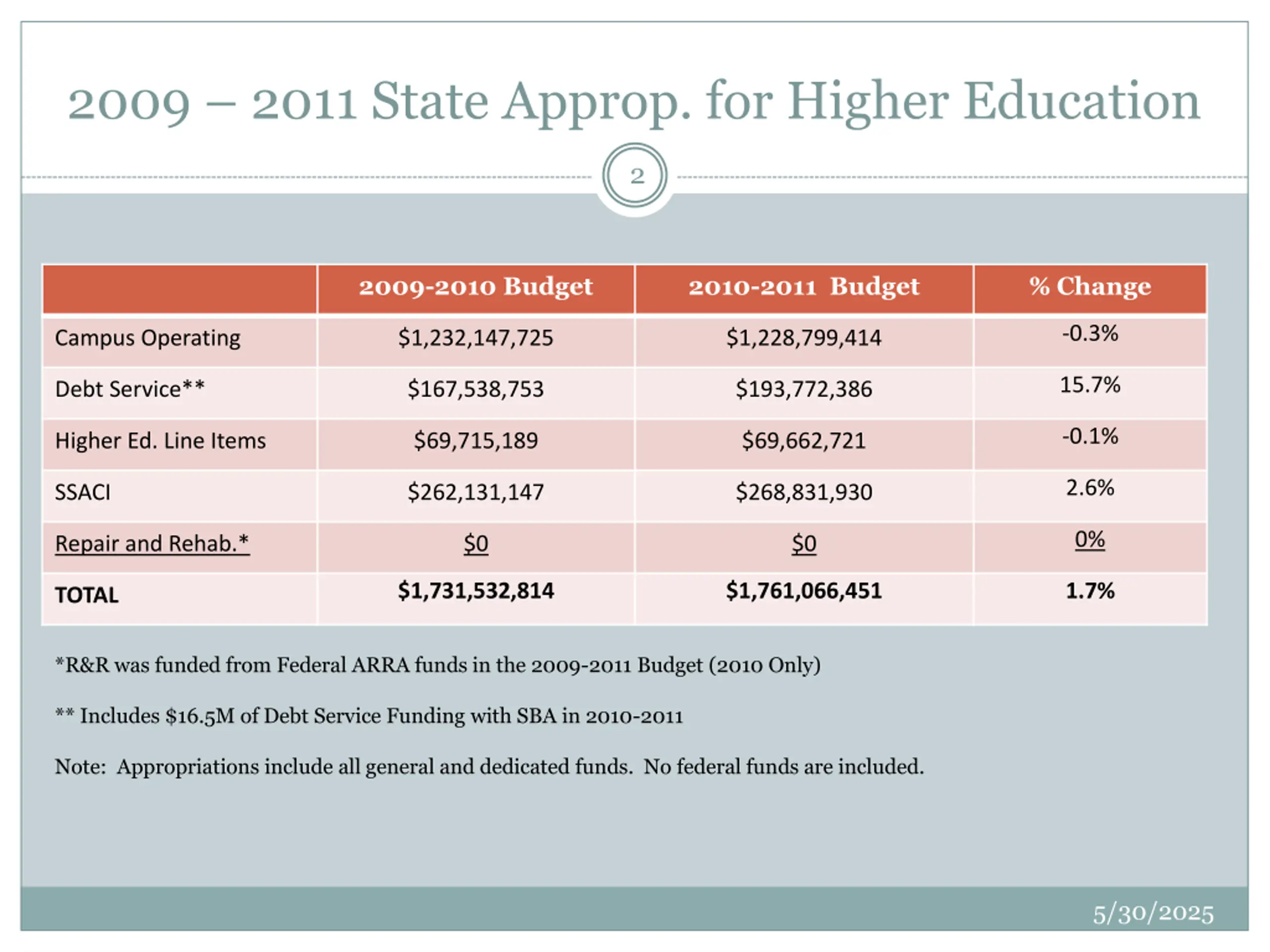 2009 2011 State Approp. for Higher Education 2 2009-2010 Budget 2010-2011 Budget % Change -0.3% Campus Operating $1,232,147,725 $1,228,799,414 15.7% Debt Service** $167,538,753 $193,772,386 -0.1% Higher Ed. Line Items $69,715,189 $69,662,721 2.6% SSACI $262,131,147 $268,831,930 0% Repair and Rehab.* $0 $0 $1,731,532,814 $1,761,066,451 1.7% TOTAL *R&R was funded from Federal ARRA funds in the 2009-2011 Budget (2010 Only) ** Includes $16.5M of Debt Service Funding with SBA in 2010-2011 Note: Appropriations include all general and dedicated funds. No federal funds are included. 5/30/2025