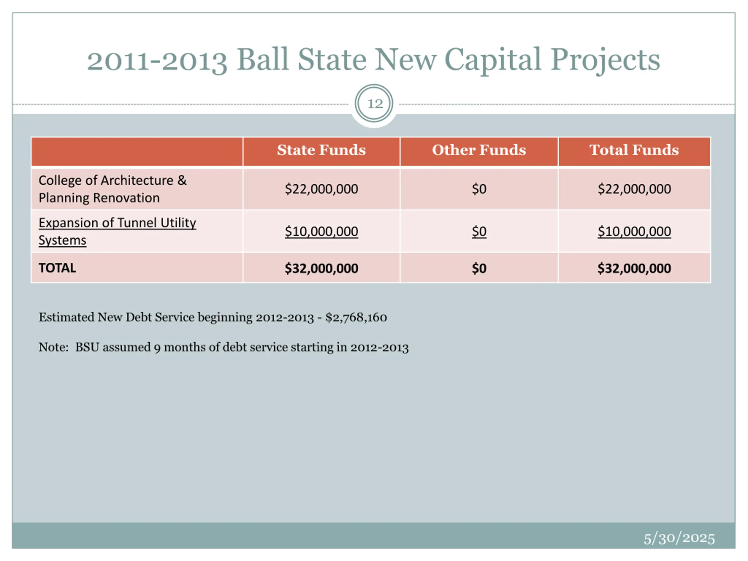 2011-2013 Ball State New Capital Projects 12 State Funds Other Funds Total Funds College of Architecture & Planning Renovation $22,000,000 $0 $22,000,000 Expansion of Tunnel Utility Systems $10,000,000 $0 $10,000,000 TOTAL $32,000,000 $0 $32,000,000 Estimated New Debt Service beginning 2012-2013 - $2,768,160 Note: BSU assumed 9 months of debt service starting in 2012-2013 5/30/2025