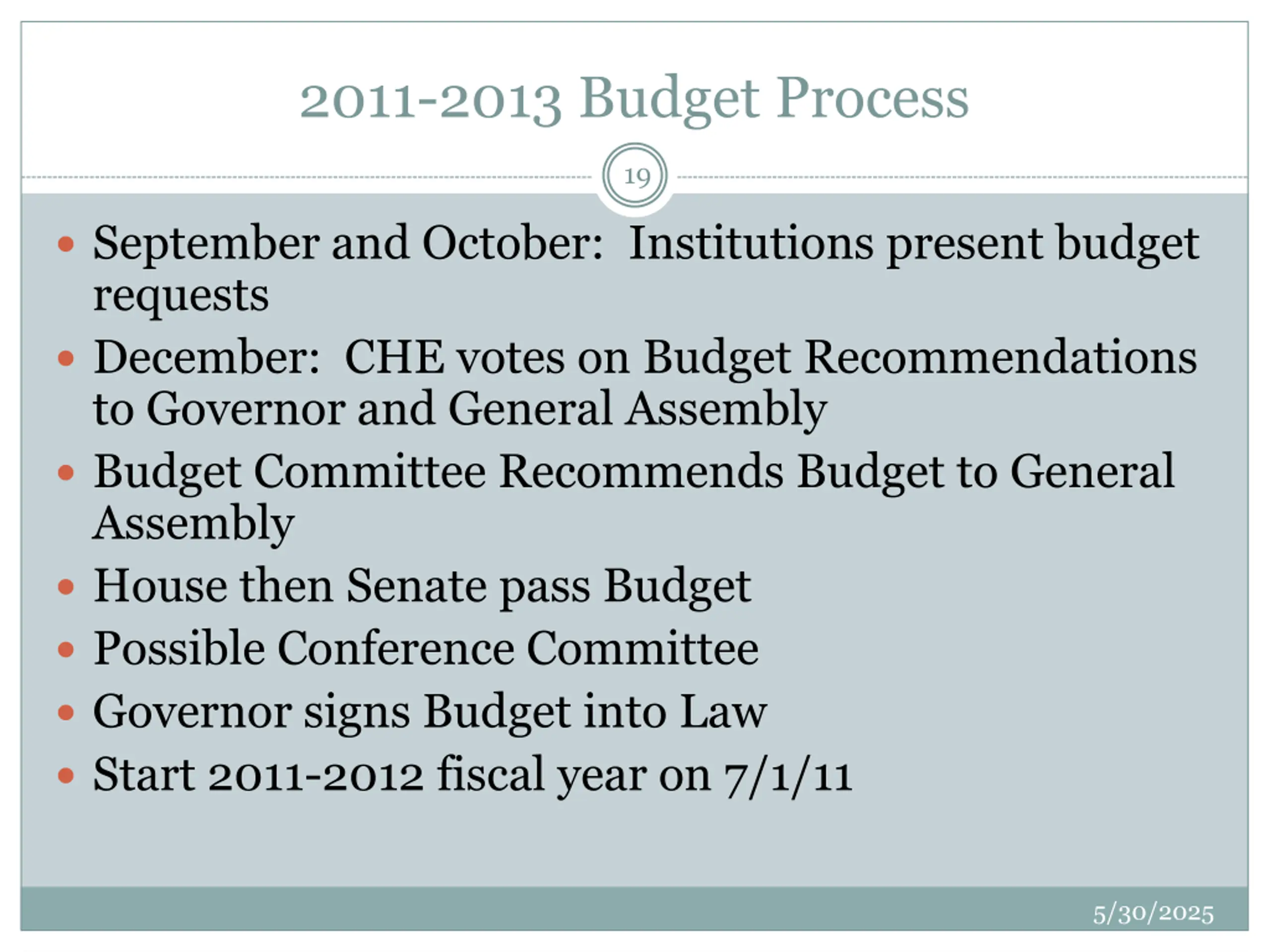 2011-2013 Budget Process 19 September and October: Institutions present budget requests December: CHE votes on Budget Recommendations to Governor and General Assembly Budget Committee Recommends Budget to General Assembly House then Senate pass Budget Possible Conference Committee Governor signs Budget into Law Start 2011-2012 fiscal year on 7/1/11 5/30/2025