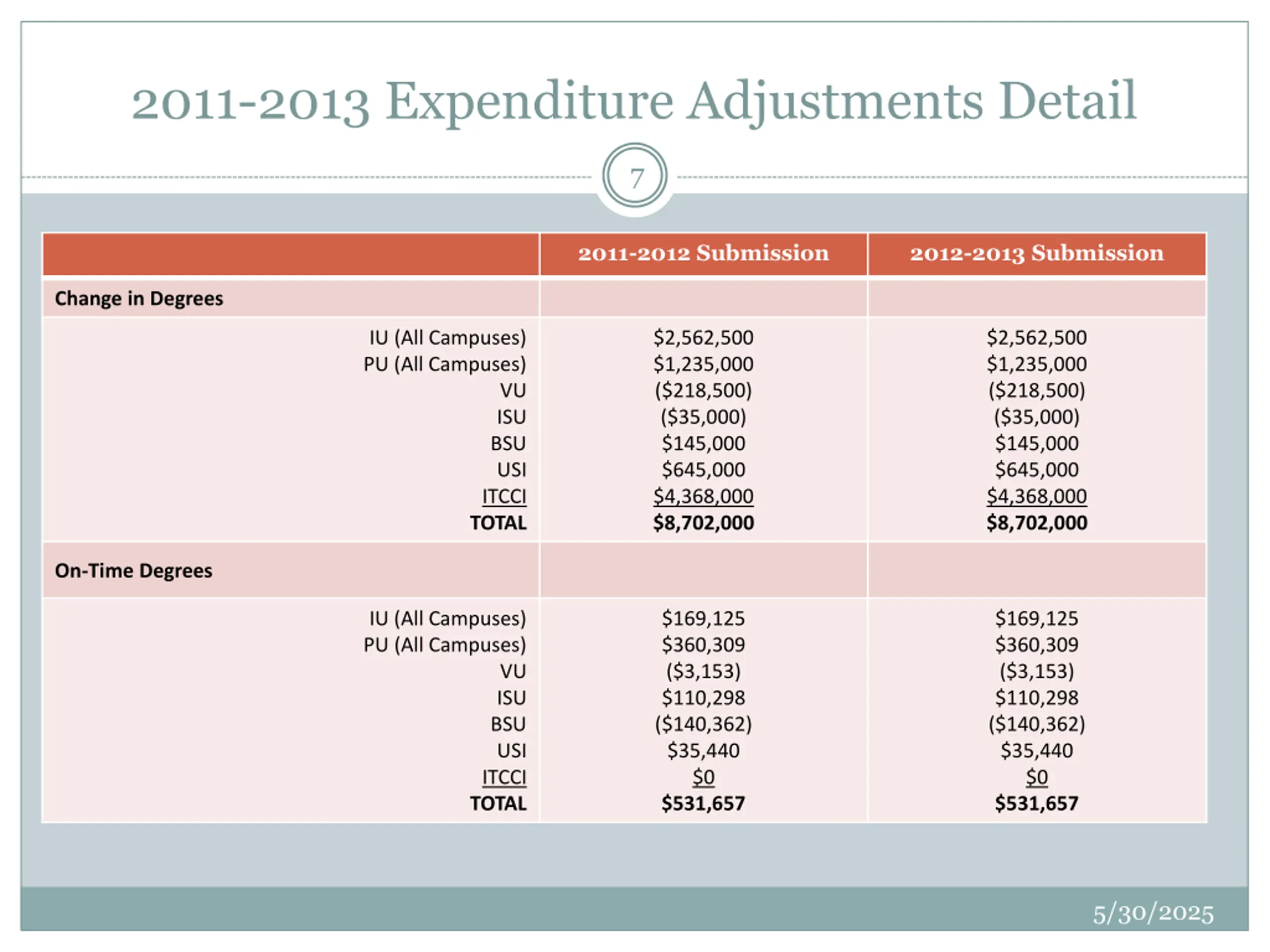 2011-2013 Expenditure Adjustments Detail 7 2011-2012 Submission 2012-2013 Submission Change in Degrees IU (All Campuses) PU (All Campuses) $2,562,500 $1,235,000 ($218,500) ($35,000) $145,000 $645,000 $4,368,000 $8,702,000 $2,562,500 $1,235,000 ($218,500) ($35,000) $145,000 $645,000 $4,368,000 $8,702,000 VU ISU BSU USI ITCCI TOTAL On-Time Degrees IU (All Campuses) PU (All Campuses) $169,125 $360,309 ($3,153) $110,298 ($140,362) $35,440 $0 $531,657 $169,125 $360,309 ($3,153) $110,298 ($140,362) $35,440 $0 $531,657 VU ISU BSU USI ITCCI TOTAL 5/30/2025