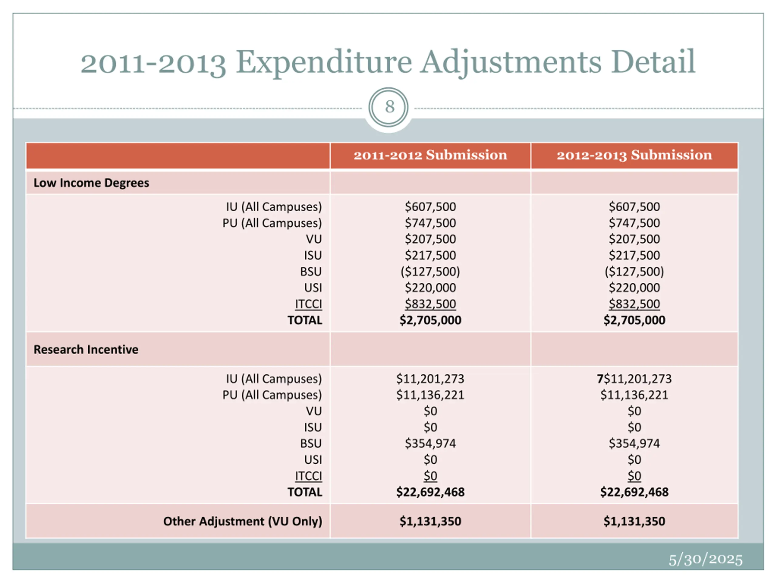 2011-2013 Expenditure Adjustments Detail 8 2011-2012 Submission 2012-2013 Submission Low Income Degrees IU (All Campuses) PU (All Campuses) $607,500 $747,500 $207,500 $217,500 ($127,500) $220,000 $832,500 $2,705,000 $607,500 $747,500 $207,500 $217,500 ($127,500) $220,000 $832,500 $2,705,000 VU ISU BSU USI ITCCI TOTAL Research Incentive IU (All Campuses) PU (All Campuses) $11,201,273 $11,136,221 $0 $0 $354,974 $0 $0 $22,692,468 7$11,201,273 $11,136,221 $0 $0 $354,974 $0 $0 $22,692,468 VU ISU BSU USI ITCCI TOTAL Other Adjustment (VU Only) $1,131,350 $1,131,350 5/30/2025