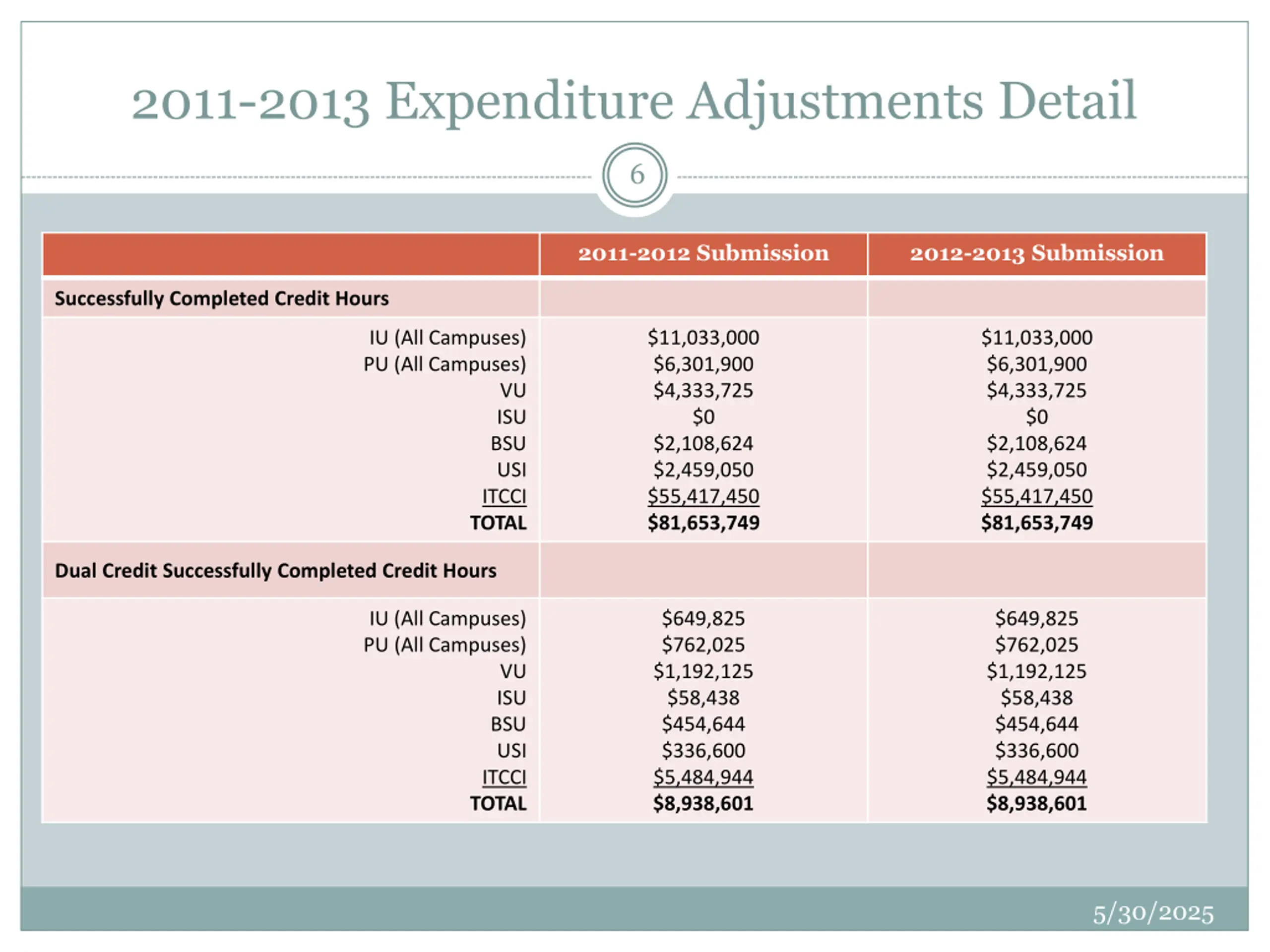 2011-2013 Expenditure Adjustments Detail 6 2011-2012 Submission 2012-2013 Submission Successfully Completed Credit Hours IU (All Campuses) PU (All Campuses) $11,033,000 $6,301,900 $4,333,725 $0 $2,108,624 $2,459,050 $55,417,450 $81,653,749 $11,033,000 $6,301,900 $4,333,725 $0 $2,108,624 $2,459,050 $55,417,450 $81,653,749 VU ISU BSU USI ITCCI TOTAL Dual Credit Successfully Completed Credit Hours IU (All Campuses) PU (All Campuses) $649,825 $762,025 $1,192,125 $58,438 $454,644 $336,600 $5,484,944 $8,938,601 $649,825 $762,025 $1,192,125 $58,438 $454,644 $336,600 $5,484,944 $8,938,601 VU ISU BSU USI ITCCI TOTAL 5/30/2025