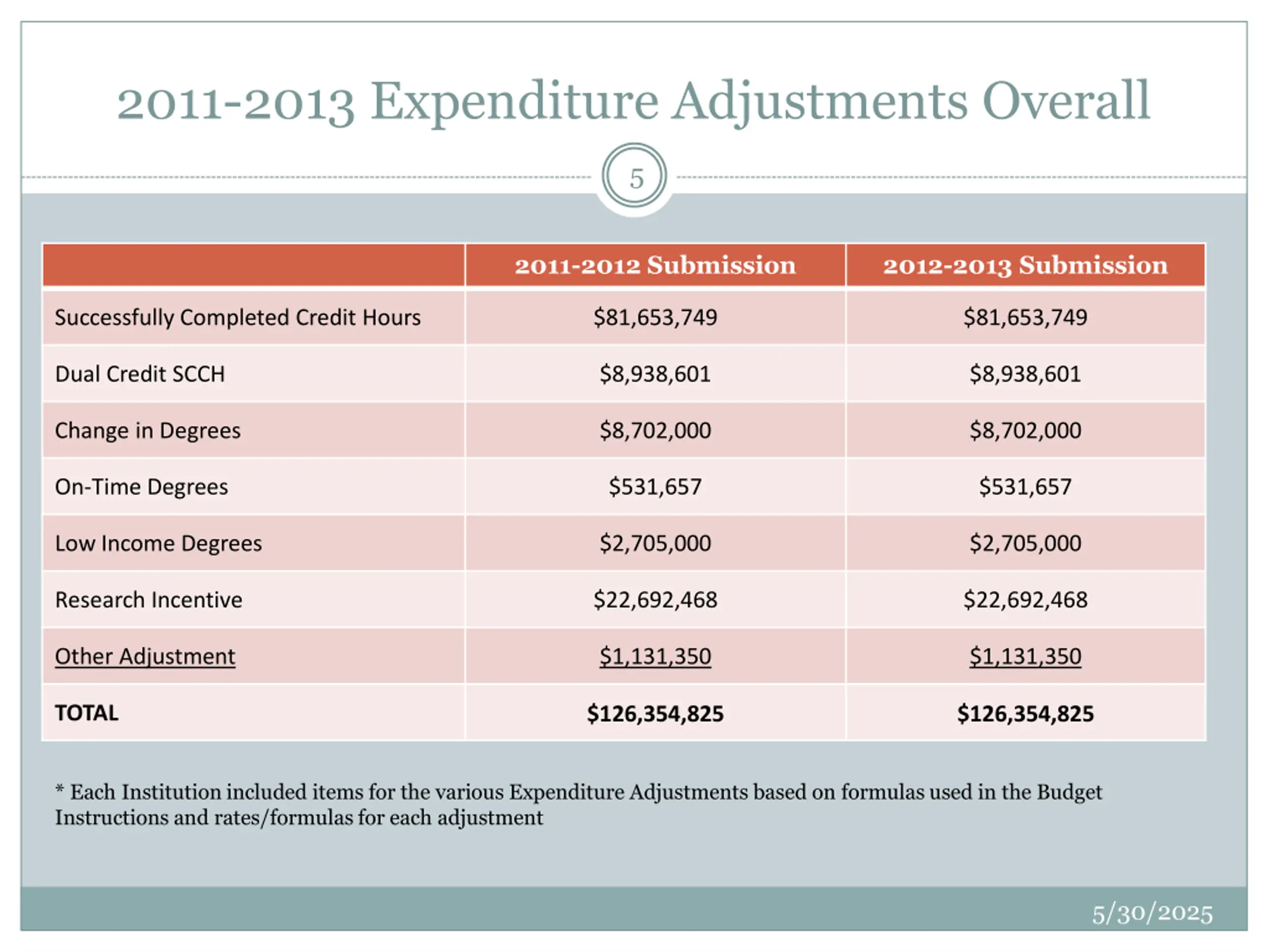 2011-2013 Expenditure Adjustments Overall 5 2011-2012 Submission 2012-2013 Submission Successfully Completed Credit Hours $81,653,749 $81,653,749 Dual Credit SCCH $8,938,601 $8,938,601 Change in Degrees $8,702,000 $8,702,000 On-Time Degrees $531,657 $531,657 Low Income Degrees $2,705,000 $2,705,000 Research Incentive $22,692,468 $22,692,468 Other Adjustment $1,131,350 $1,131,350 TOTAL $126,354,825 $126,354,825 * Each Institution included items for the various Expenditure Adjustments based on formulas used in the Budget Instructions and rates/formulas for each adjustment 5/30/2025