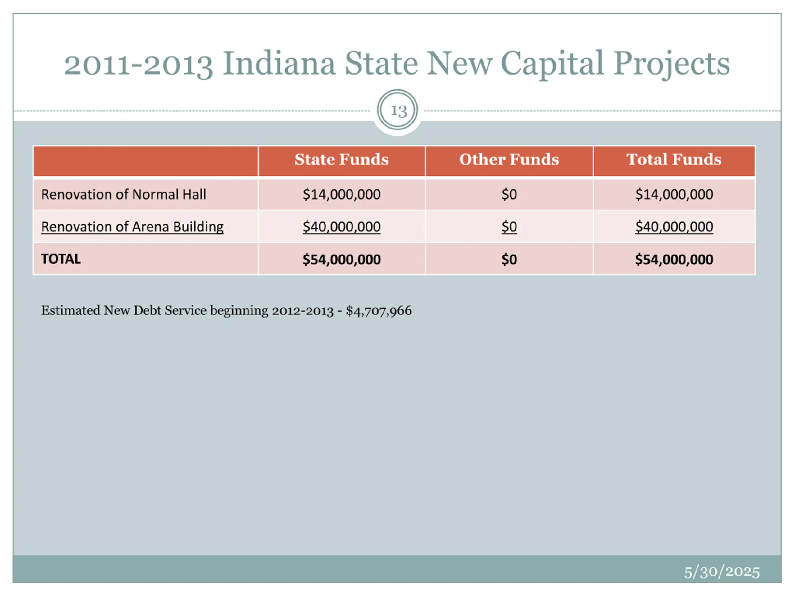 2011-2013 Indiana State New Capital Projects 13 State Funds Other Funds Total Funds Renovation of Normal Hall $14,000,000 $0 $14,000,000 Renovation of Arena Building $40,000,000 $0 $40,000,000 TOTAL $54,000,000 $0 $54,000,000 Estimated New Debt Service beginning 2012-2013 - $4,707,966 5/30/2025