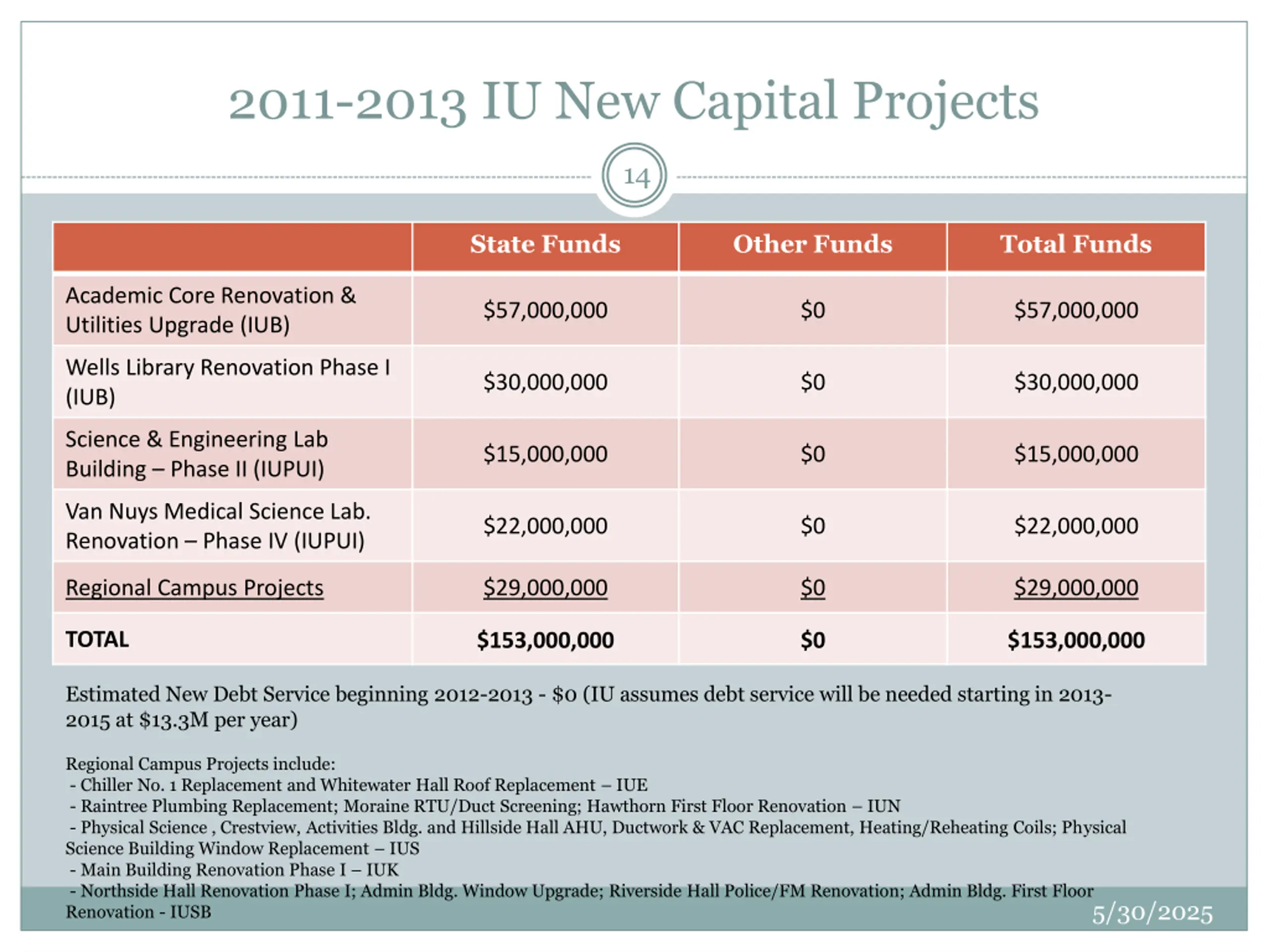 2011-2013 IU New Capital Projects 14 State Funds Other Funds Total Funds Academic Core Renovation & Utilities Upgrade (IUB) $57,000,000 $0 $57,000,000 Wells Library Renovation Phase I (IUB) $30,000,000 $0 $30,000,000 Science & Engineering Lab Building Phase II (IUPUI) $15,000,000 $0 $15,000,000 Van Nuys Medical Science Lab. Renovation Phase IV (IUPUI) $22,000,000 $0 $22,000,000 Regional Campus Projects $29,000,000 $0 $29,000,000 TOTAL $153,000,000 $0 $153,000,000 Estimated New Debt Service beginning 2012-2013 - $0 (IU assumes debt service will be needed starting in 2013- 2015 at $13.3M per year) Regional Campus Projects include: - Chiller No. 1 Replacement and Whitewater Hall Roof Replacement IUE - Raintree Plumbing Replacement; Moraine RTU/Duct Screening; Hawthorn First Floor Renovation IUN - Physical Science , Crestview, Activities Bldg. and Hillside Hall AHU, Ductwork & VAC Replacement, Heating/Reheating Coils; Physical Science Building Window Replacement IUS - Main Building Renovation Phase I IUK - Northside Hall Renovation Phase I; Admin Bldg. Window Upgrade; Riverside Hall Police/FM Renovation; Admin Bldg. First Floor Renovation - IUSB 5/30/2025