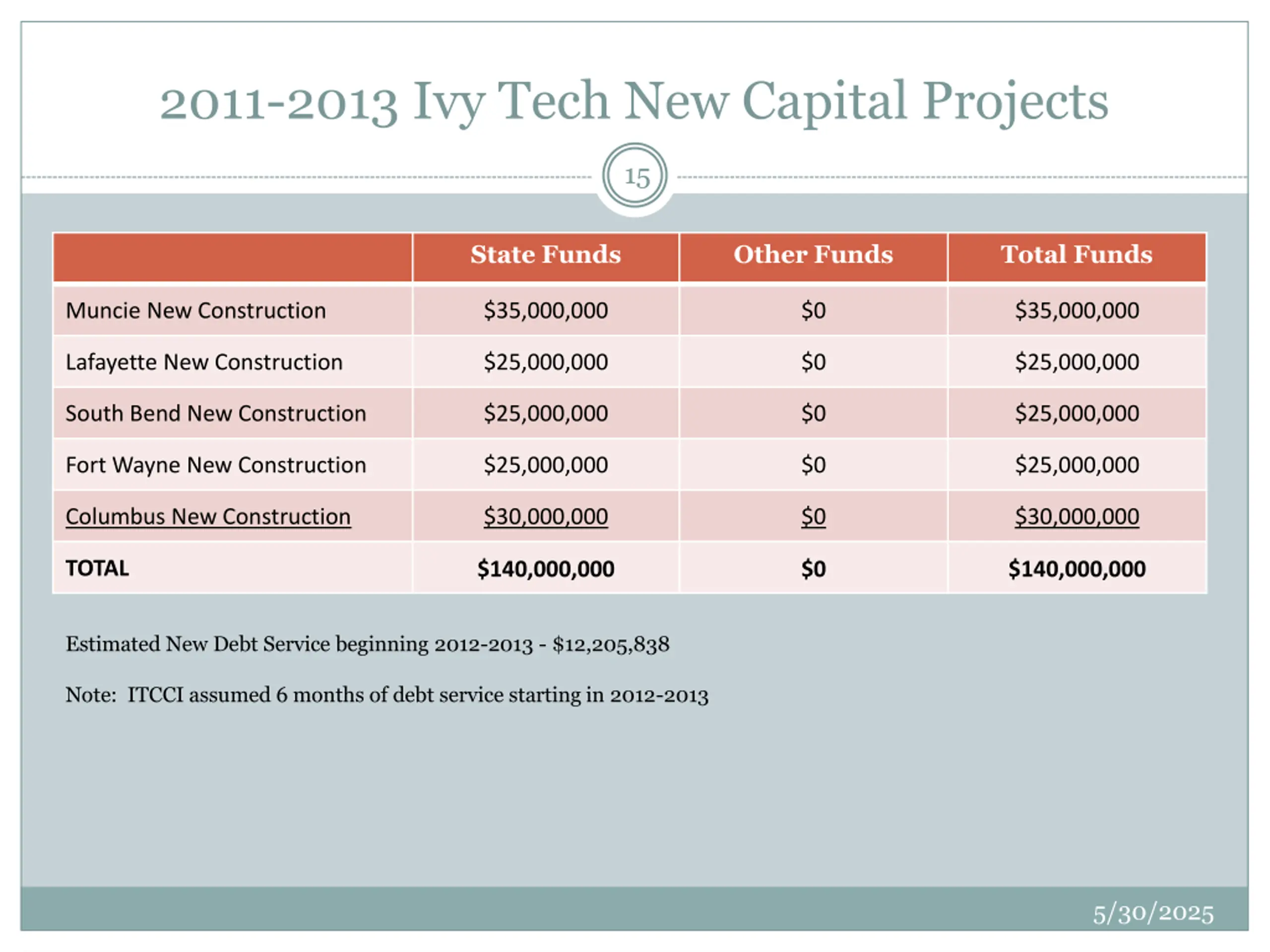 2011-2013 Ivy Tech New Capital Projects 15 State Funds Other Funds Total Funds Muncie New Construction $35,000,000 $0 $35,000,000 Lafayette New Construction $25,000,000 $0 $25,000,000 South Bend New Construction $25,000,000 $0 $25,000,000 Fort Wayne New Construction $25,000,000 $0 $25,000,000 Columbus New Construction $30,000,000 $0 $30,000,000 TOTAL $140,000,000 $0 $140,000,000 Estimated New Debt Service beginning 2012-2013 - $12,205,838 Note: ITCCI assumed 6 months of debt service starting in 2012-2013 5/30/2025