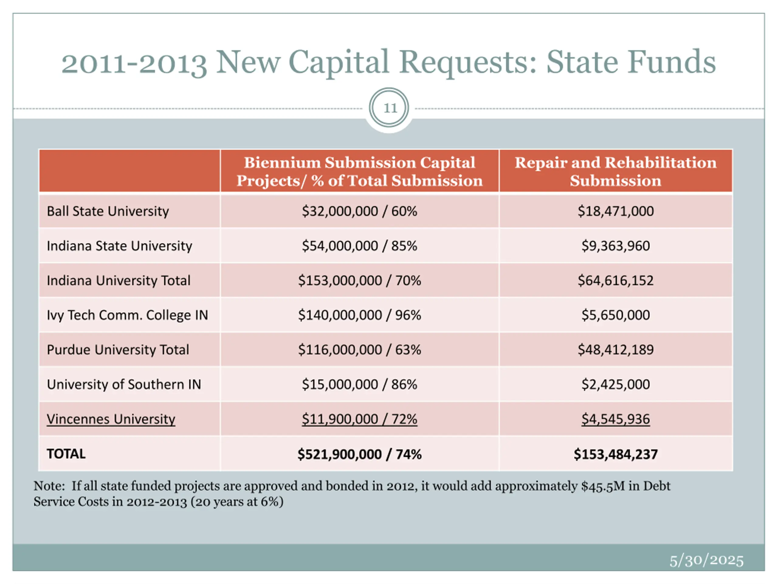 2011-2013 New Capital Requests: State Funds 11 Biennium Submission Capital Projects/ % of Total Submission Repair and Rehabilitation Submission Ball State University $32,000,000 / 60% $18,471,000 Indiana State University $54,000,000 / 85% $9,363,960 Indiana University Total $153,000,000 / 70% $64,616,152 Ivy Tech Comm. College IN $140,000,000 / 96% $5,650,000 Purdue University Total $116,000,000 / 63% $48,412,189 University of Southern IN $15,000,000 / 86% $2,425,000 Vincennes University $11,900,000 / 72% $4,545,936 TOTAL $521,900,000 / 74% $153,484,237 Note: If all state funded projects are approved and bonded in 2012, it would add approximately $45.5M in Debt Service Costs in 2012-2013 (20 years at 6%) 5/30/2025