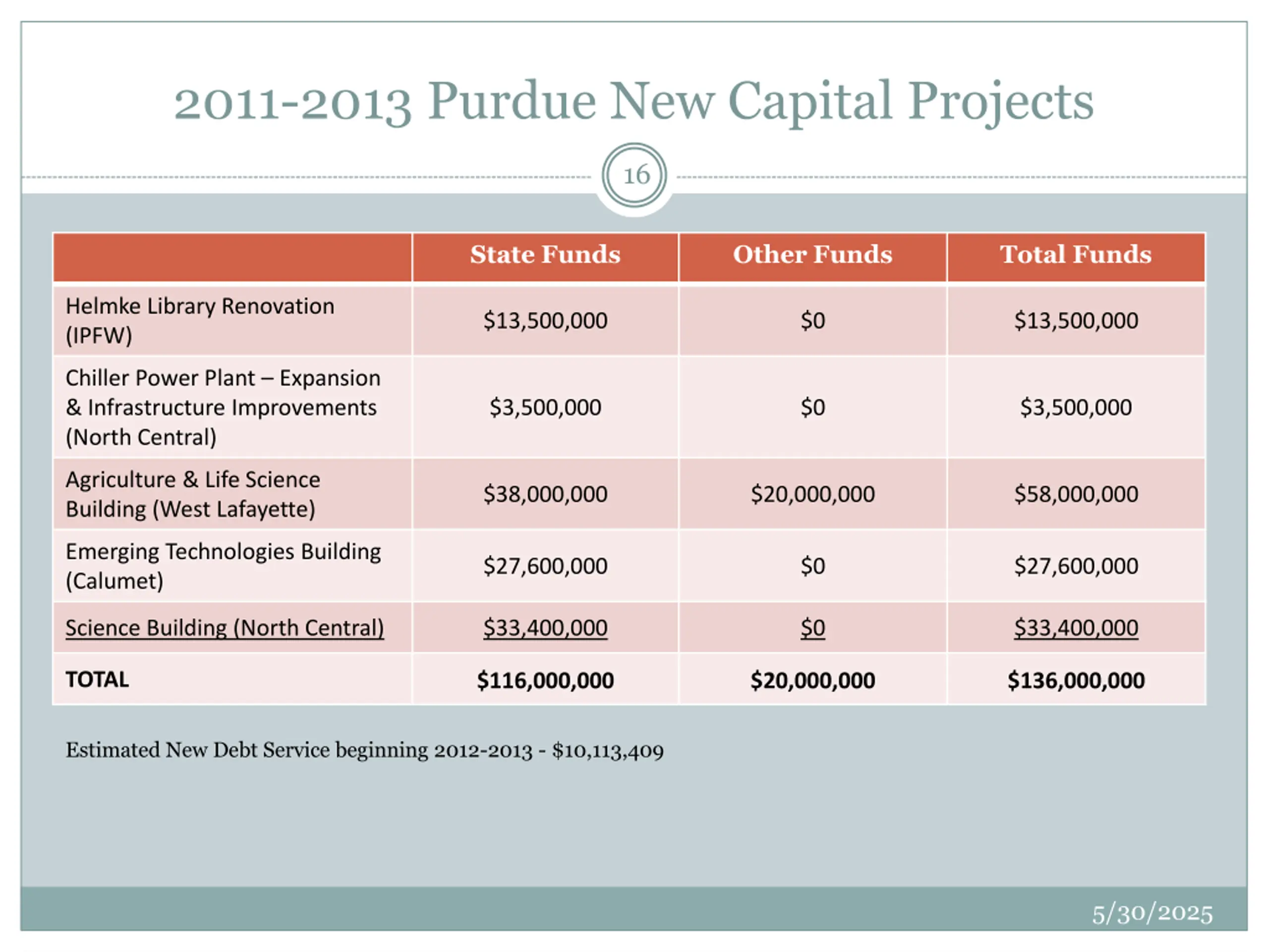 2011-2013 Purdue New Capital Projects 16 State Funds Other Funds Total Funds Helmke Library Renovation (IPFW) $13,500,000 $0 $13,500,000 Chiller Power Plant Expansion & Infrastructure Improvements (North Central) $3,500,000 $0 $3,500,000 Agriculture & Life Science Building (West Lafayette) $38,000,000 $20,000,000 $58,000,000 Emerging Technologies Building (Calumet) $27,600,000 $0 $27,600,000 Science Building (North Central) $33,400,000 $0 $33,400,000 TOTAL $116,000,000 $20,000,000 $136,000,000 Estimated New Debt Service beginning 2012-2013 - $10,113,409 5/30/2025